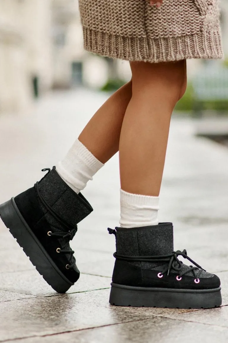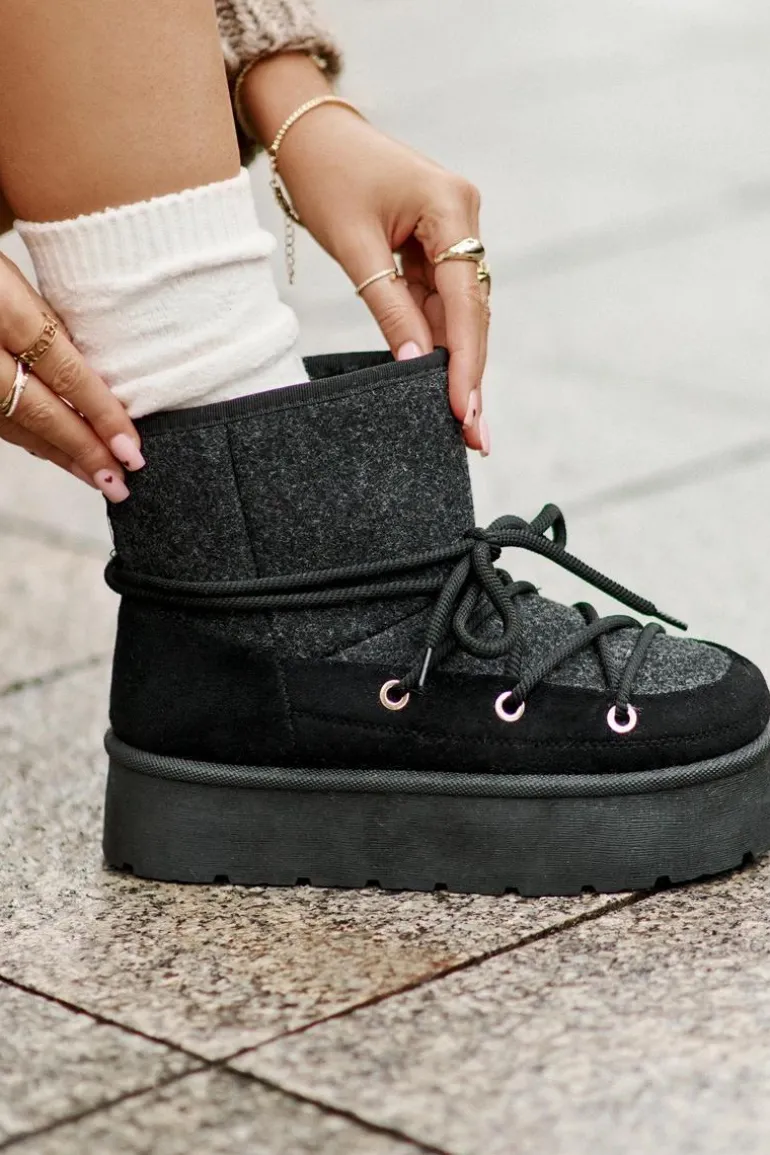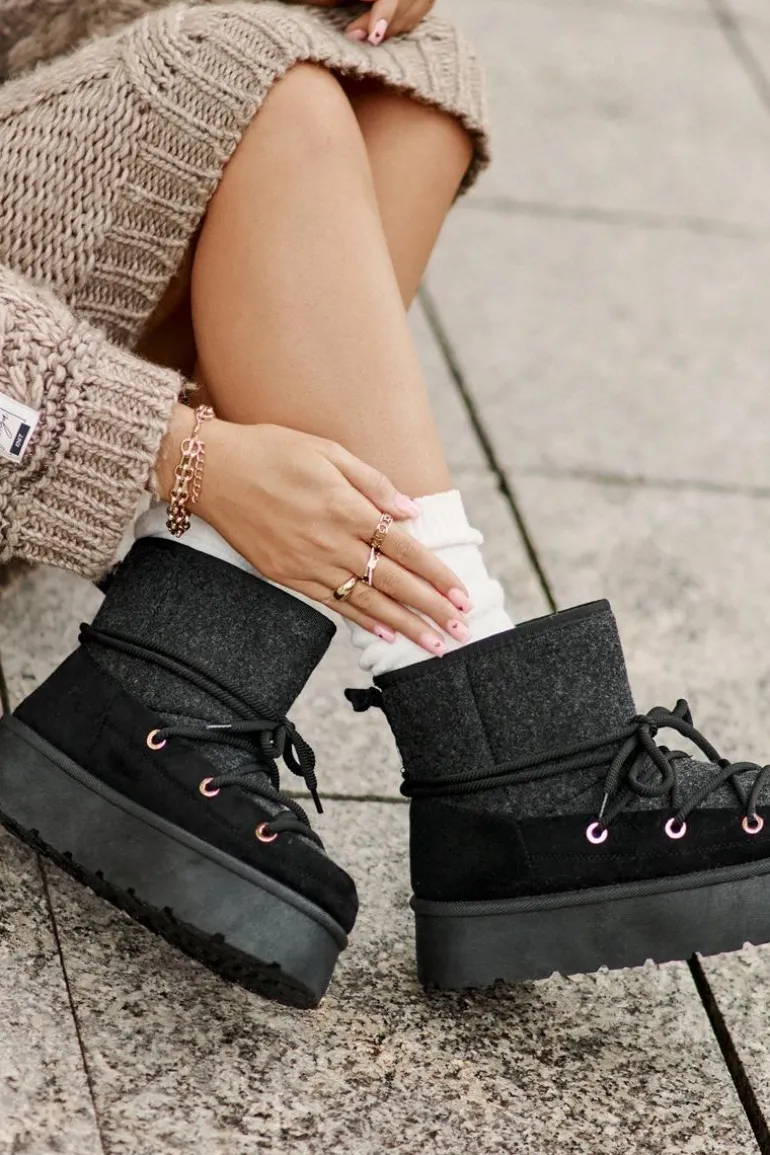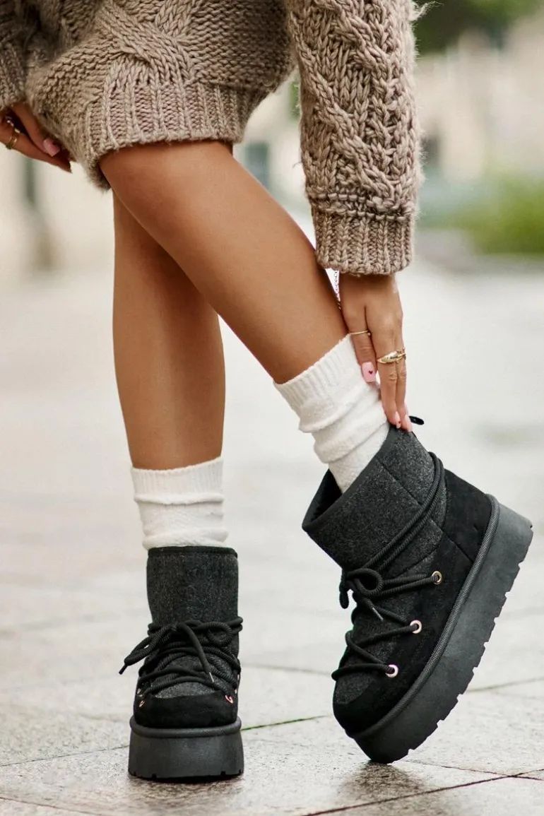 Stylowe śniegowce na platformie to idealne połączenie mody i komfortu. Posiadają praktyczne wiązanie z przodu, które zapewnia dobre dopasowanie do stopy. Wnętrze ocieplane futerkiem gwarantuje ciepło w mroźne dni. Wygodne i ciepłe, świetnie sprawdzą się zarówno na co dzień, jak i podczas zimowych spacerów. Przy wyborze rozmiaru prosimy sugerować się tabelą rozmiarów.