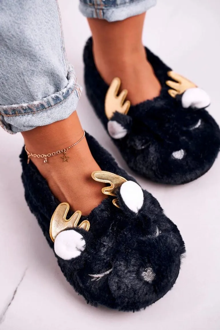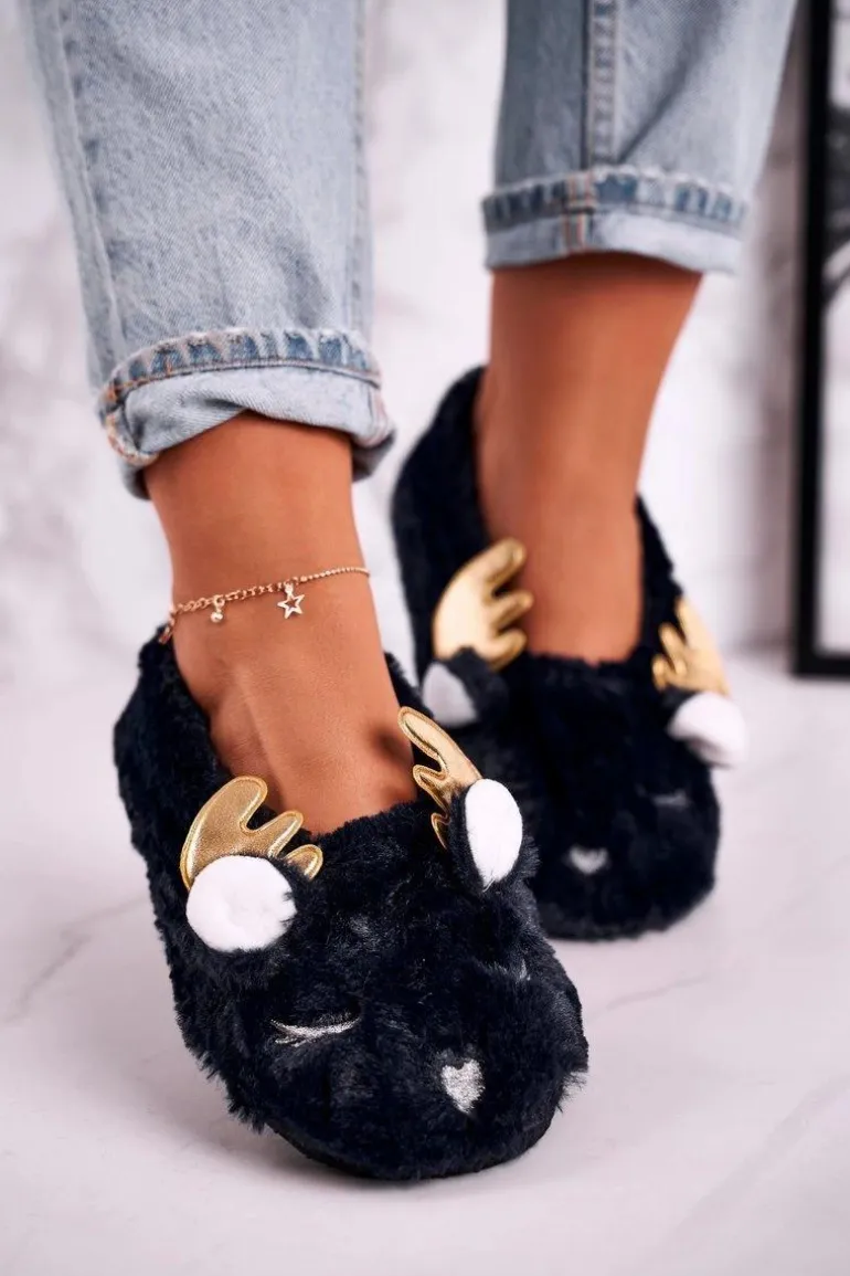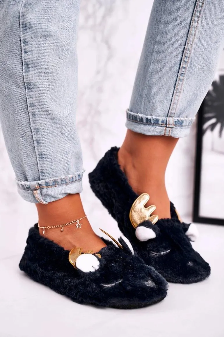 Świąteczne Ocieplane Futrzane Papcie Granatowe Jingle Bells