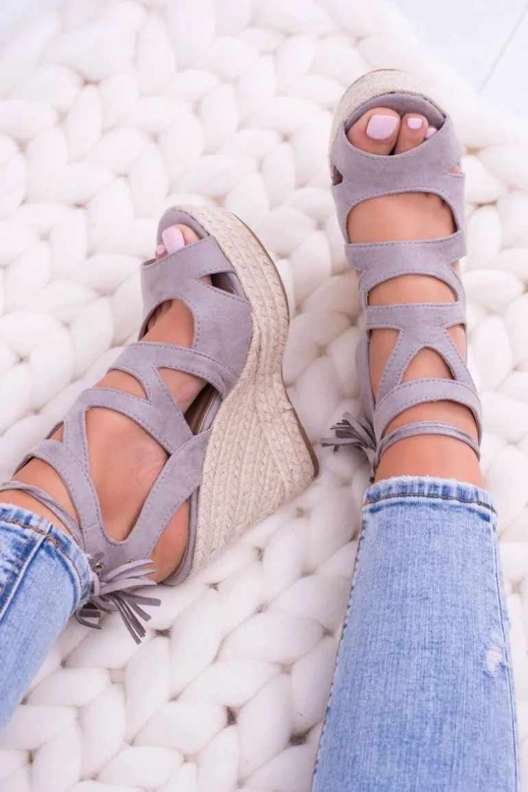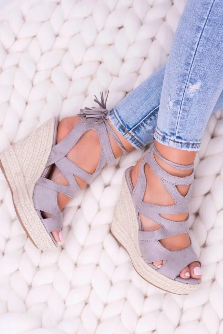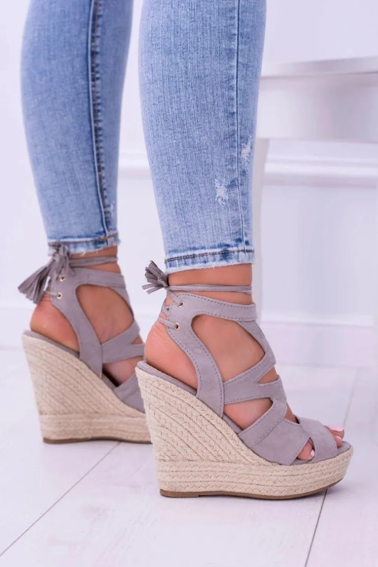 Szare Zamszowe Sandały Na Koturnie Nowelio