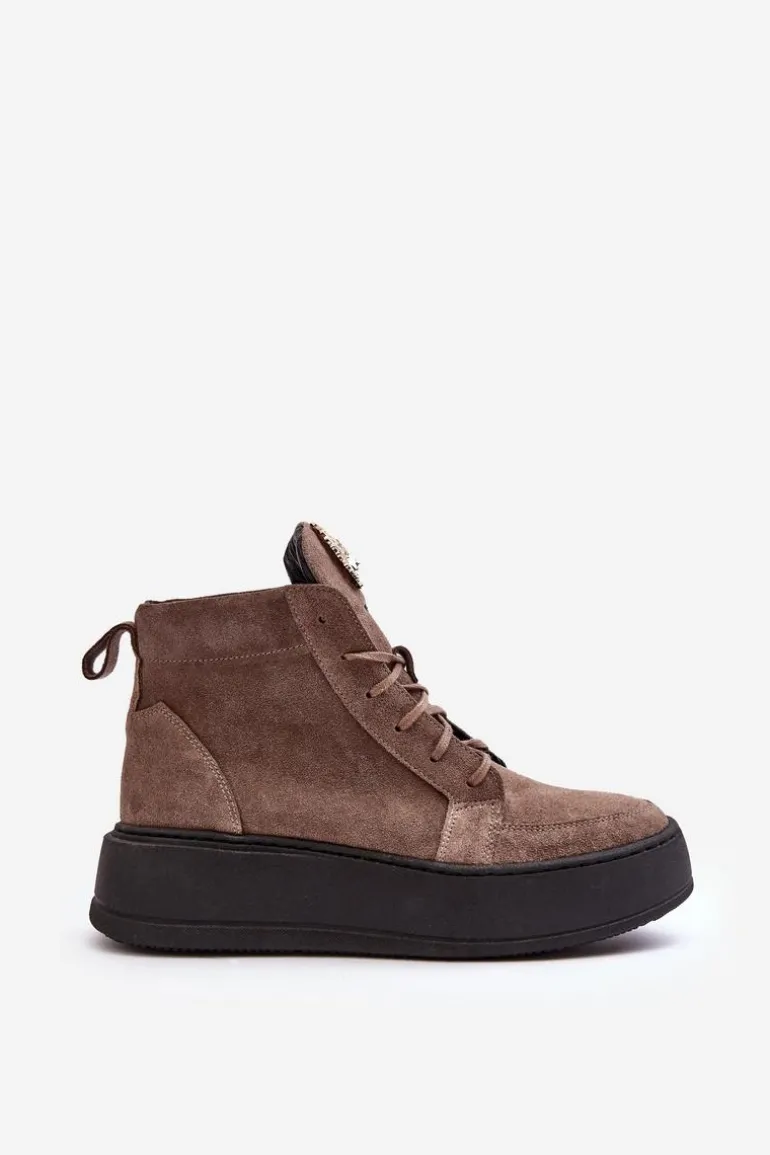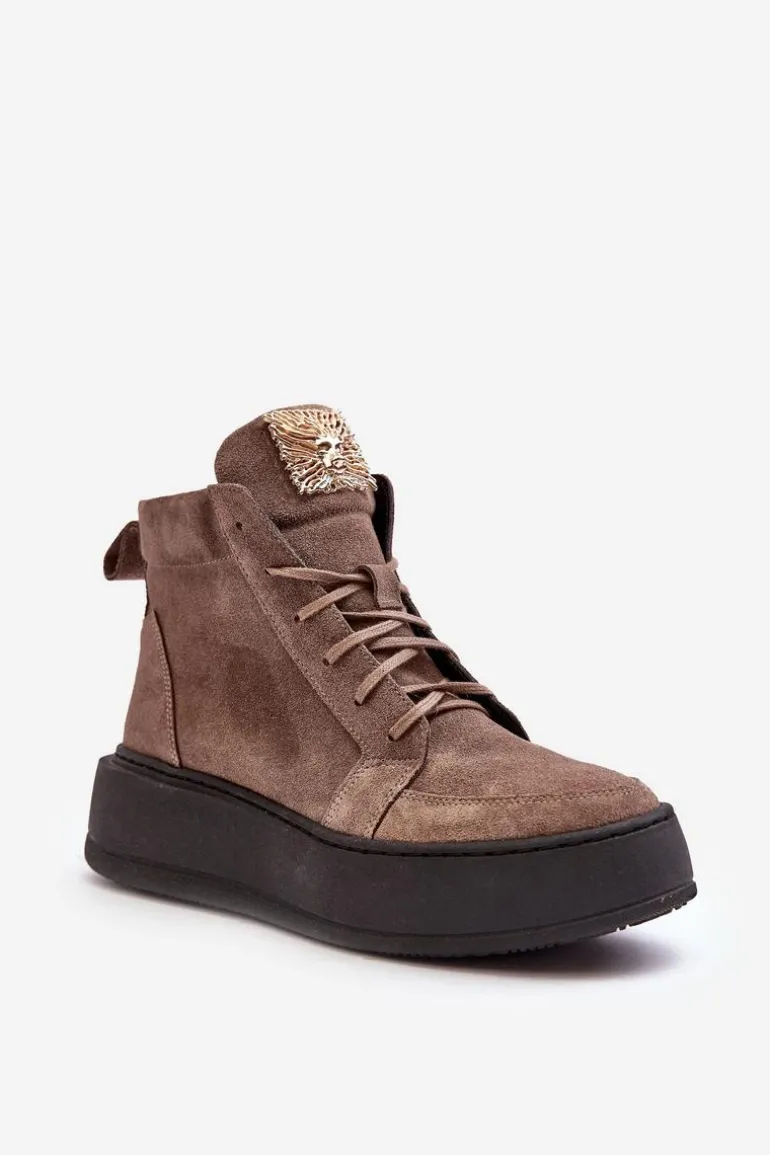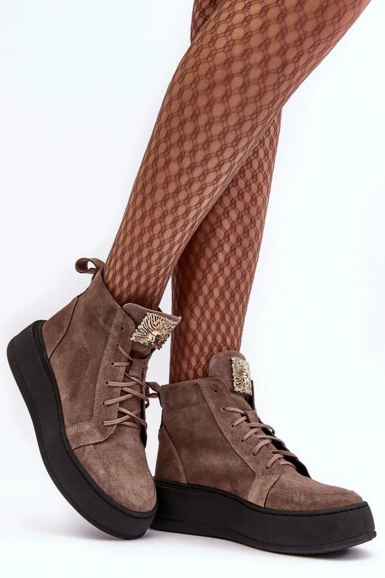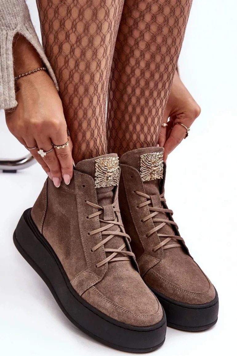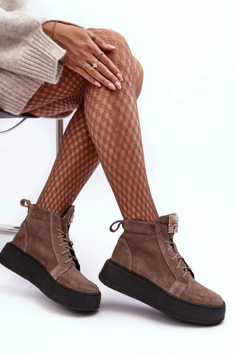 Modne botki damskie zostały wykonane z wysokiej jakości skóry naturalnej. Osadzone na platformie. Model klasycznie sznurowany. Na języku złota ozdoba z tworzywa sztucznego. Noski zaokrąglone. Zapiętek usztywniony. Miękka, skórzana wkładka zapewni Ci wysoki komfort użytkowania przez cały dzień! Koniecznie powinnaś je mieć! Przy wyborze rozmiaru prosimy sugerować się tabelą rozmiarów.