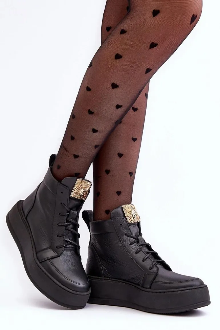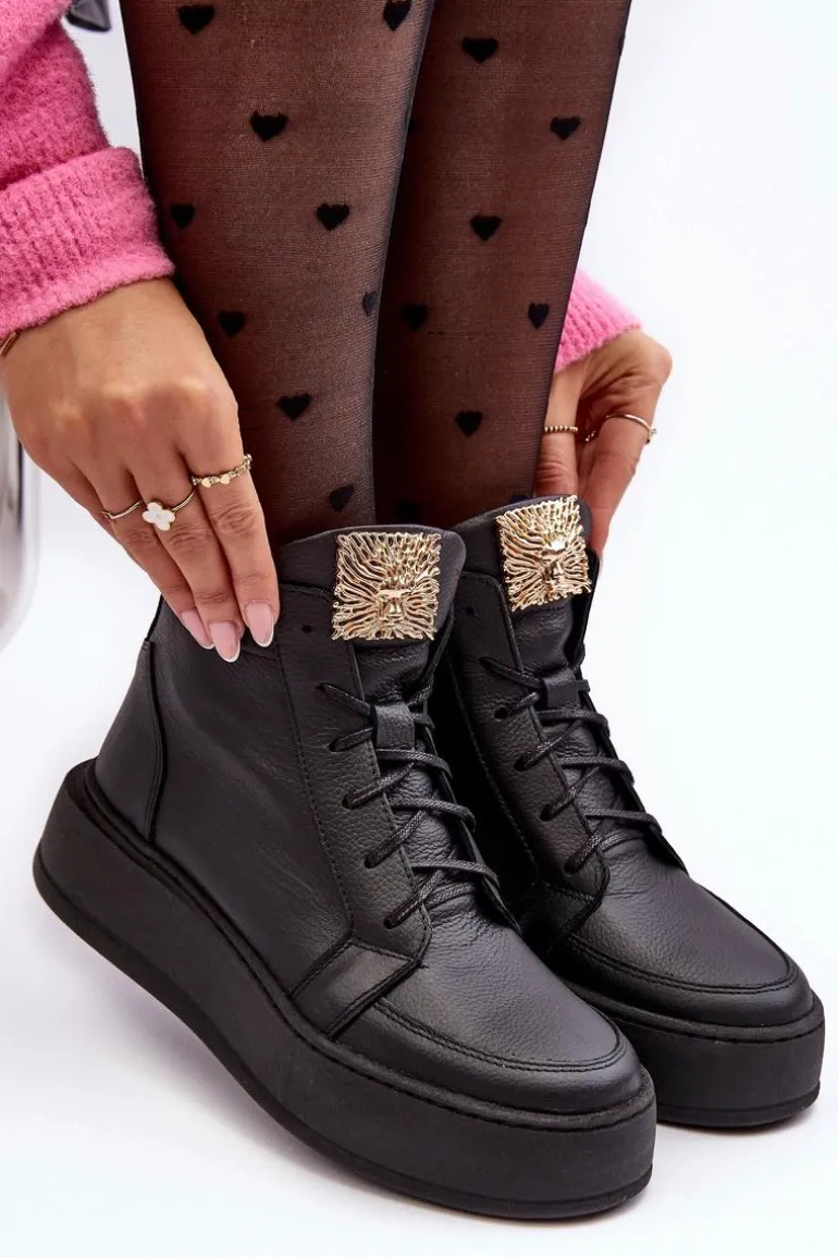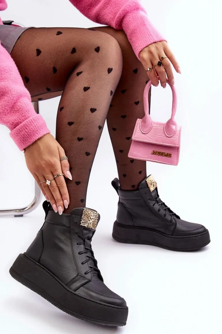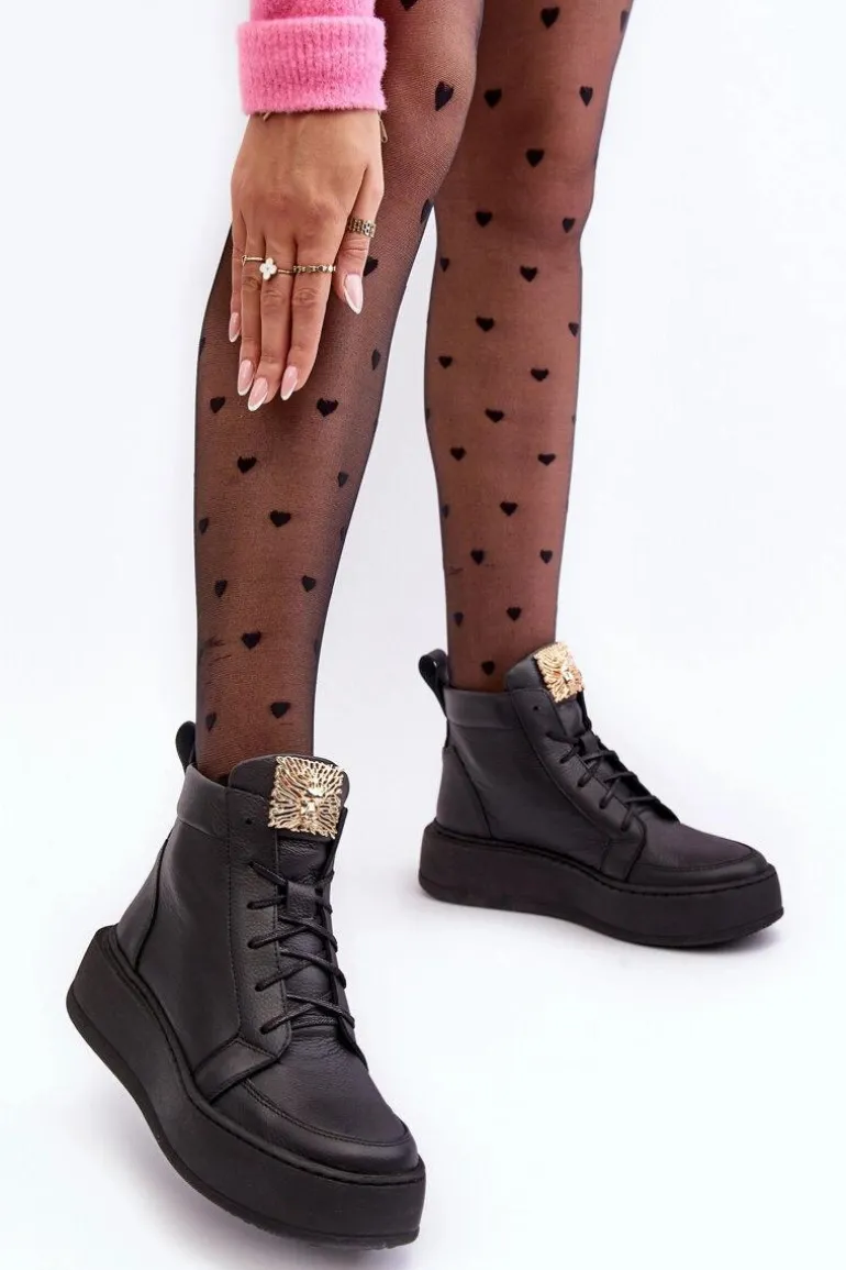 Modne botki damskie zostały wykonane z wysokiej jakości skóry naturalnej. Osadzone na platformie. Model klasycznie sznurowany. Na języku złota ozdoba z tworzywa sztucznego. Noski zaokrąglone. Zapiętek usztywniony. Miękka, skórzana wkładka zapewni Ci wysoki komfort użytkowania przez cały dzień! Koniecznie powinnaś je mieć! Przy wyborze rozmiaru prosimy sugerować się tabelą rozmiarów.