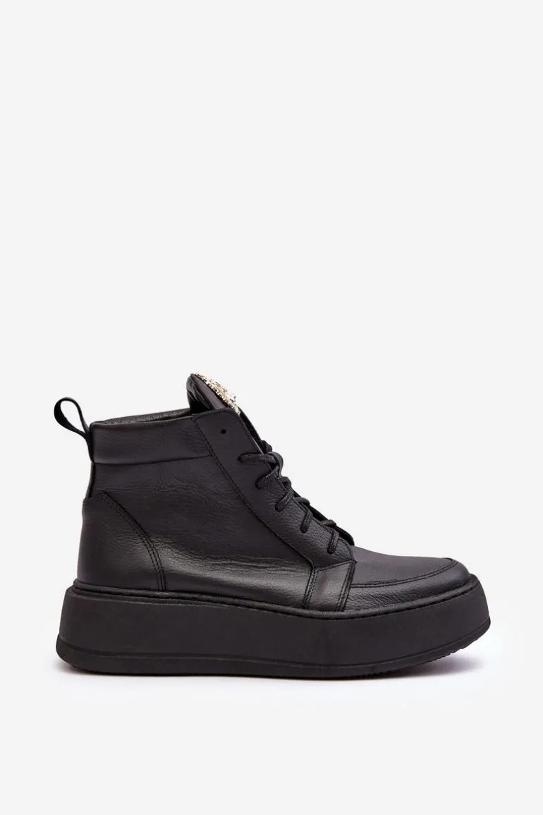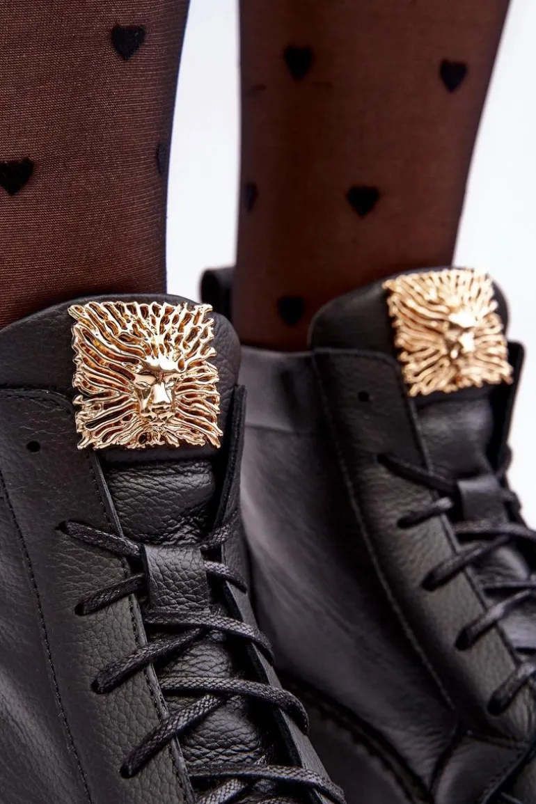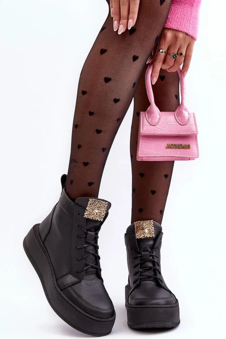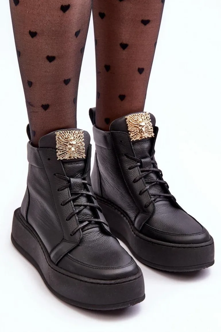 Modne botki damskie zostały wykonane z wysokiej jakości skóry naturalnej. Osadzone na platformie. Model klasycznie sznurowany. Na języku złota ozdoba z tworzywa sztucznego. Noski zaokrąglone. Zapiętek usztywniony. Miękka, skórzana wkładka zapewni Ci wysoki komfort użytkowania przez cały dzień! Koniecznie powinnaś je mieć! Przy wyborze rozmiaru prosimy sugerować się tabelą rozmiarów.