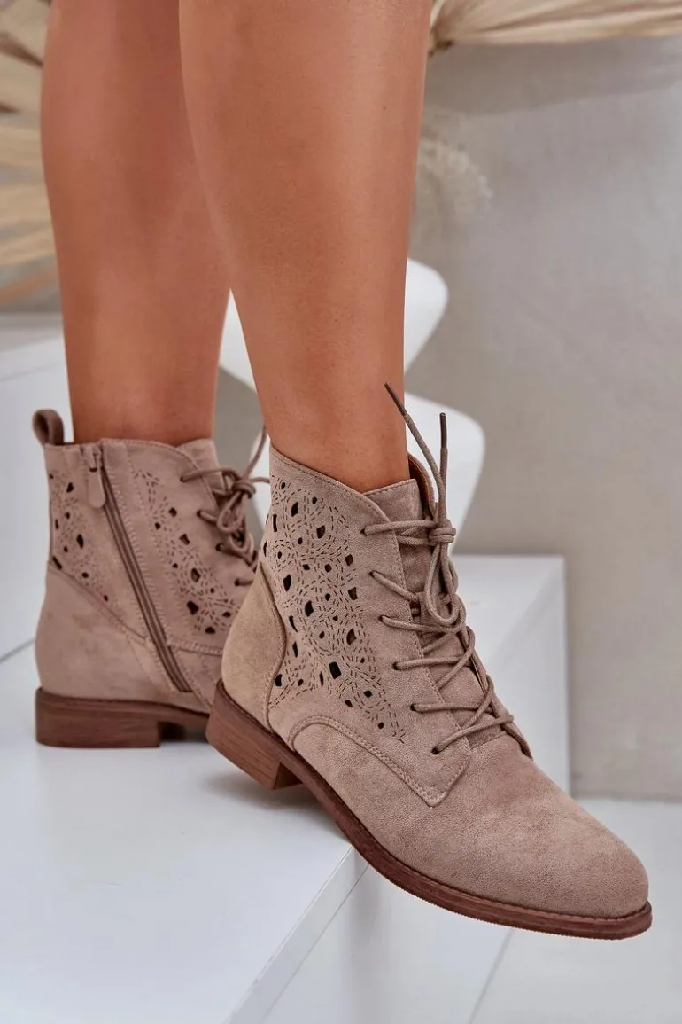 Sznurowane Botki Z Ażurowym Wzorem S.Barski HY51-136 Beżowe