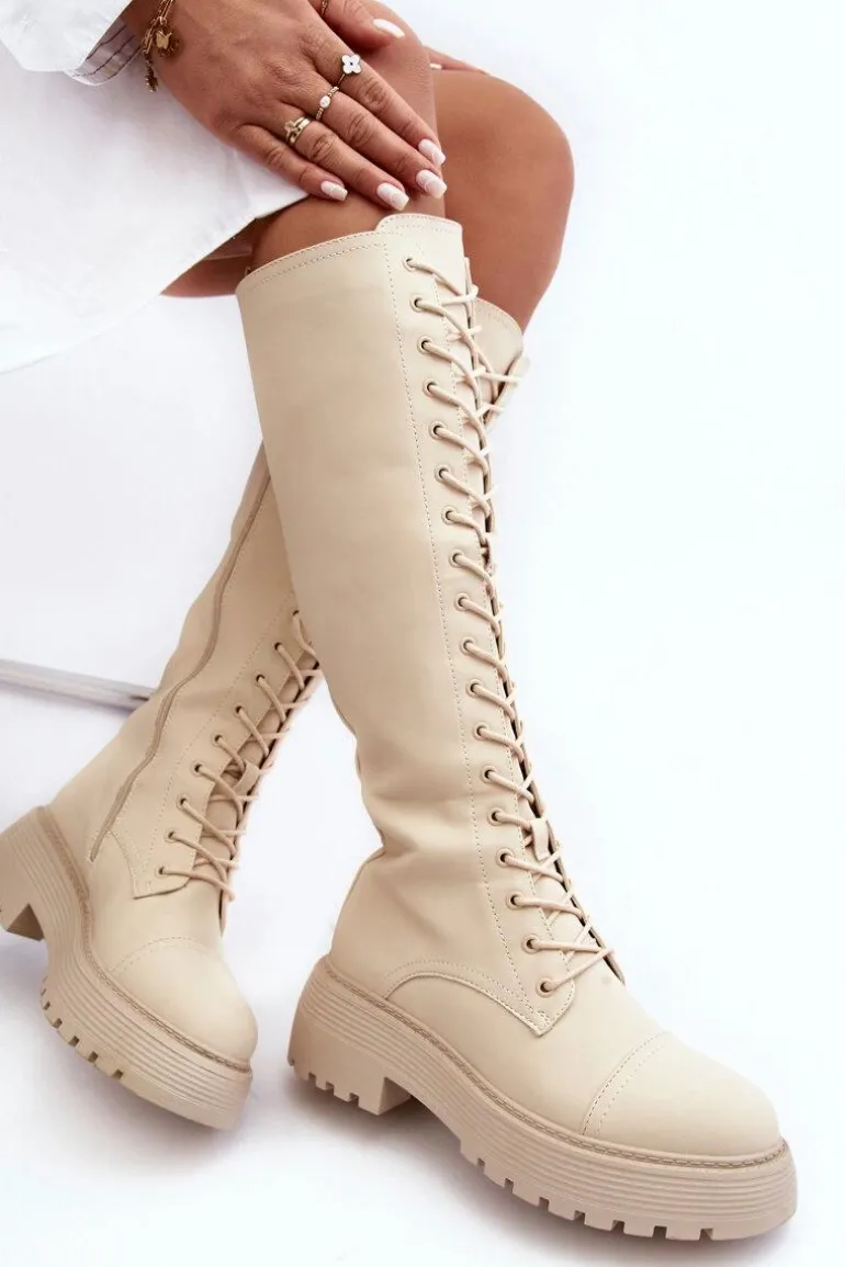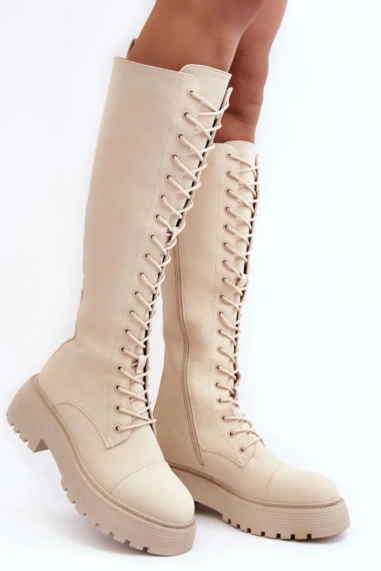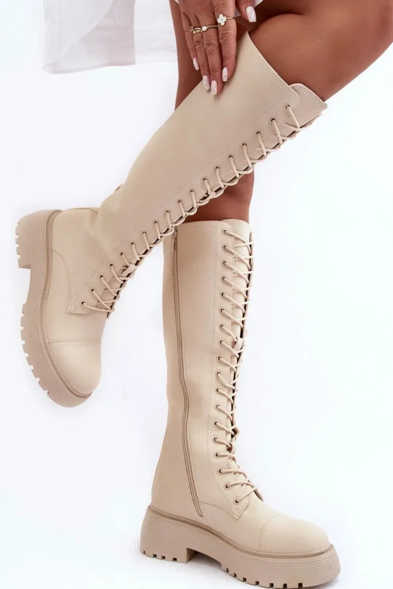 Damskie kozaki — glany posiadają sznurowanie oraz suwak na całości cholewki. Wykonane z eko skóry. Cholewka przed kolano. Środek ocieplony kocem obuwniczym. Model ten osadzony jest na płaskim obcasie i platformie. Przy wyborze rozmiaru prosimy kierować tabelą rozmiarów.
