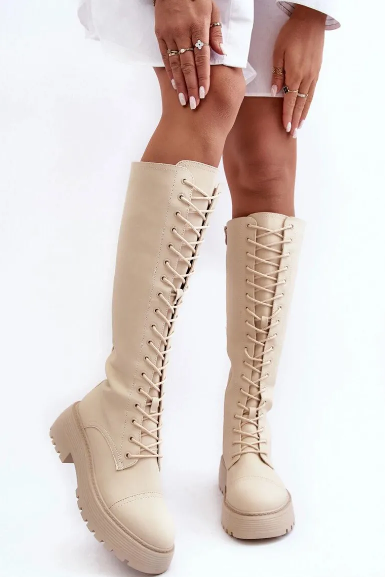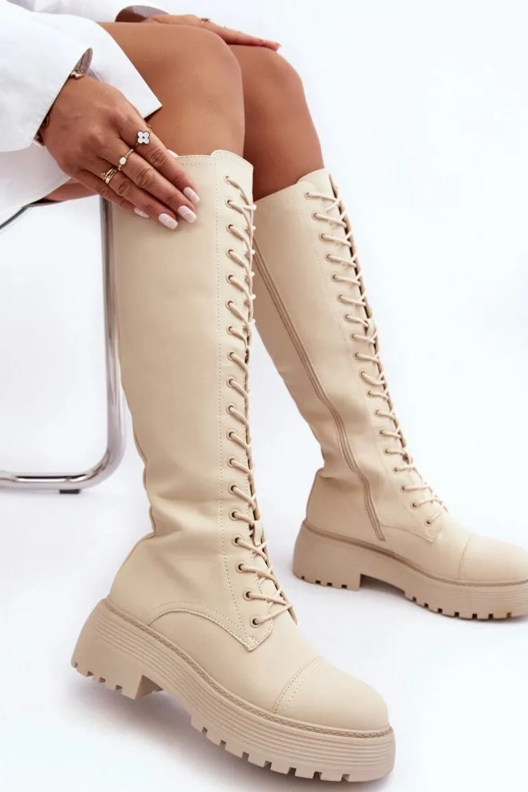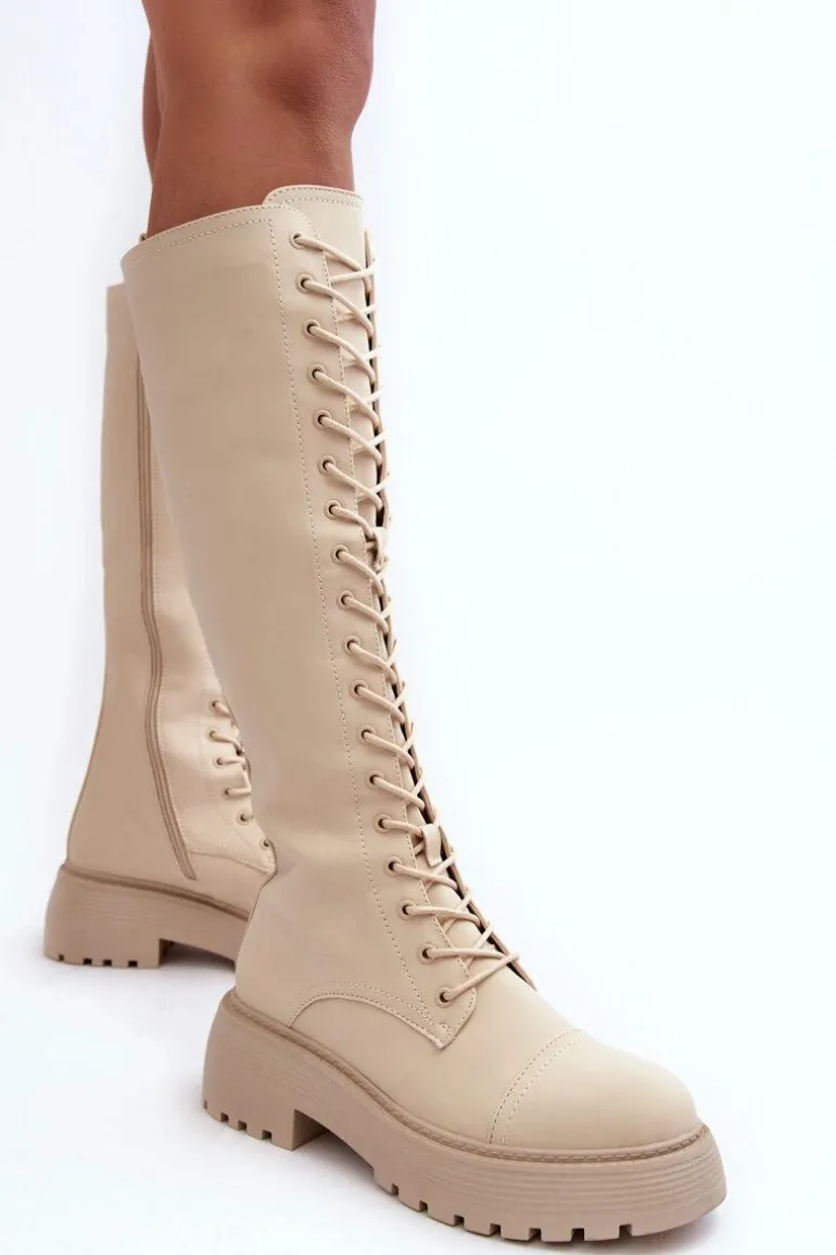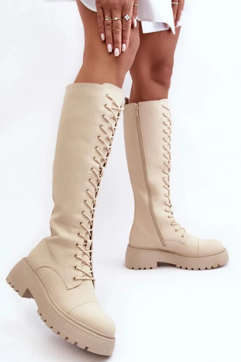 Damskie kozaki — glany posiadają sznurowanie oraz suwak na całości cholewki. Wykonane z eko skóry. Cholewka przed kolano. Środek ocieplony kocem obuwniczym. Model ten osadzony jest na płaskim obcasie i platformie. Przy wyborze rozmiaru prosimy kierować tabelą rozmiarów.
