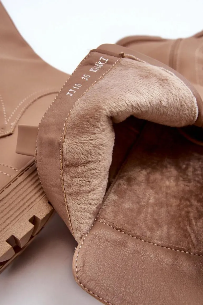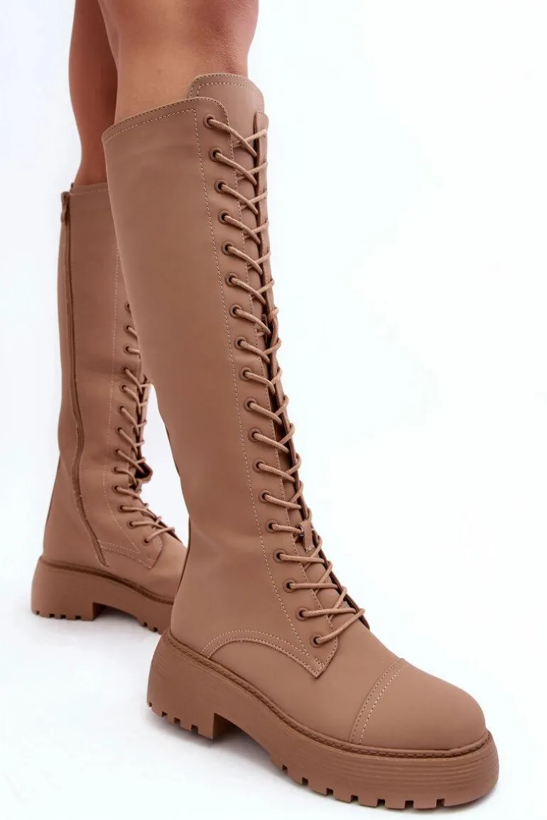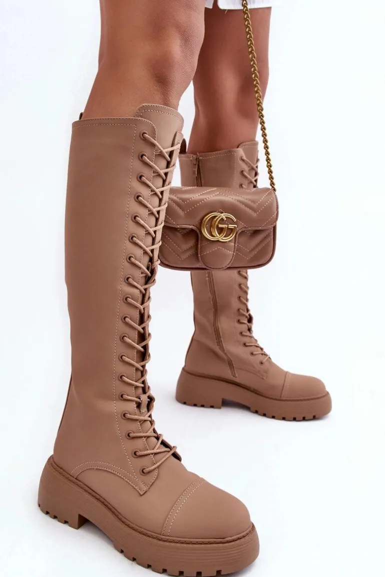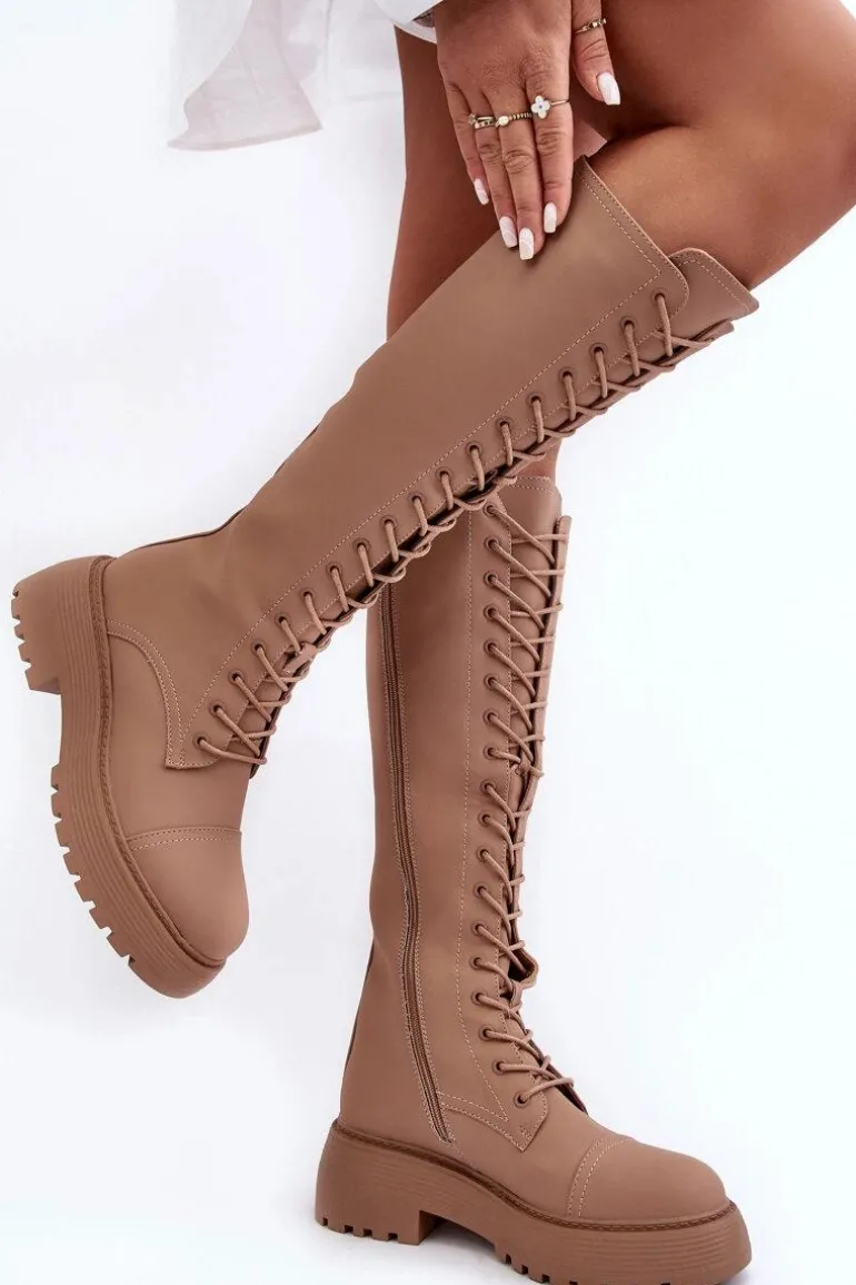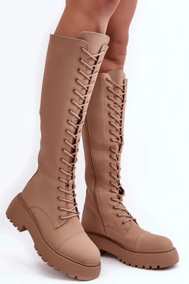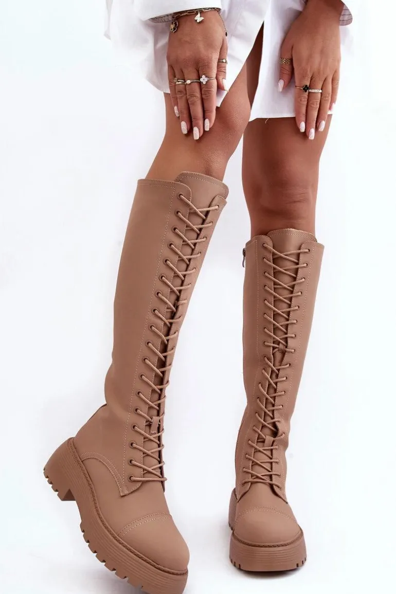Damskie kozaki — glany posiadają sznurowanie oraz suwak na całości cholewki. Wykonane z eko skóry. Cholewka przed kolano. Środek ocieplony kocem obuwniczym. Model ten osadzony jest na płaskim obcasie i platformie. Przy wyborze rozmiaru prosimy kierować tabelą rozmiarów.
