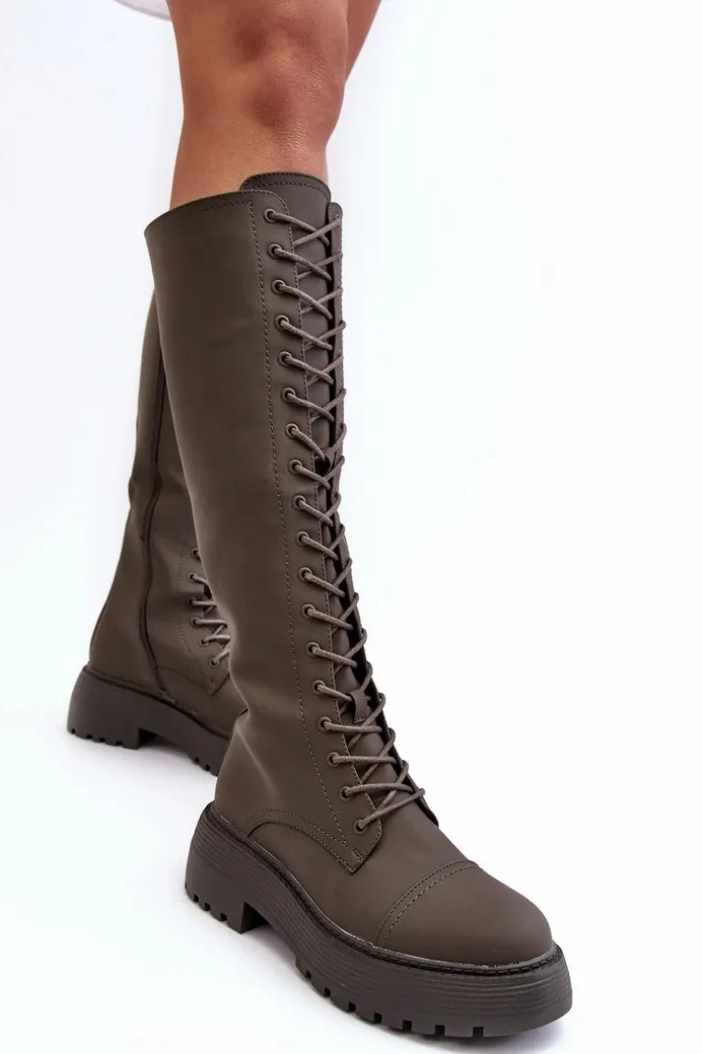 Damskie kozaki — glany posiadają sznurowanie oraz suwak na całości cholewki. Wykonane z eko skóry. Cholewka przed kolano. Środek ocieplony kocem obuwniczym. Model ten osadzony jest na płaskim obcasie i platformie. Przy wyborze rozmiaru prosimy kierować tabelą rozmiarów.