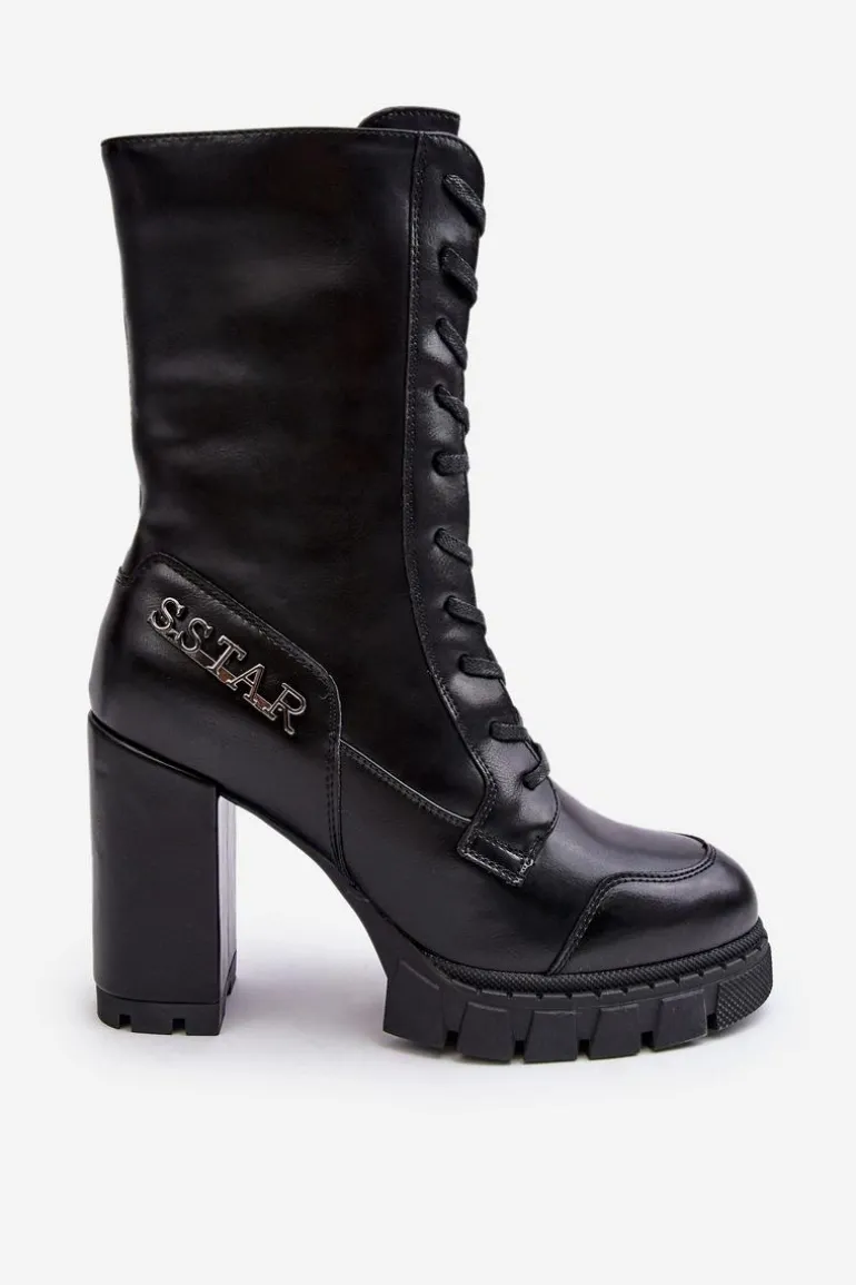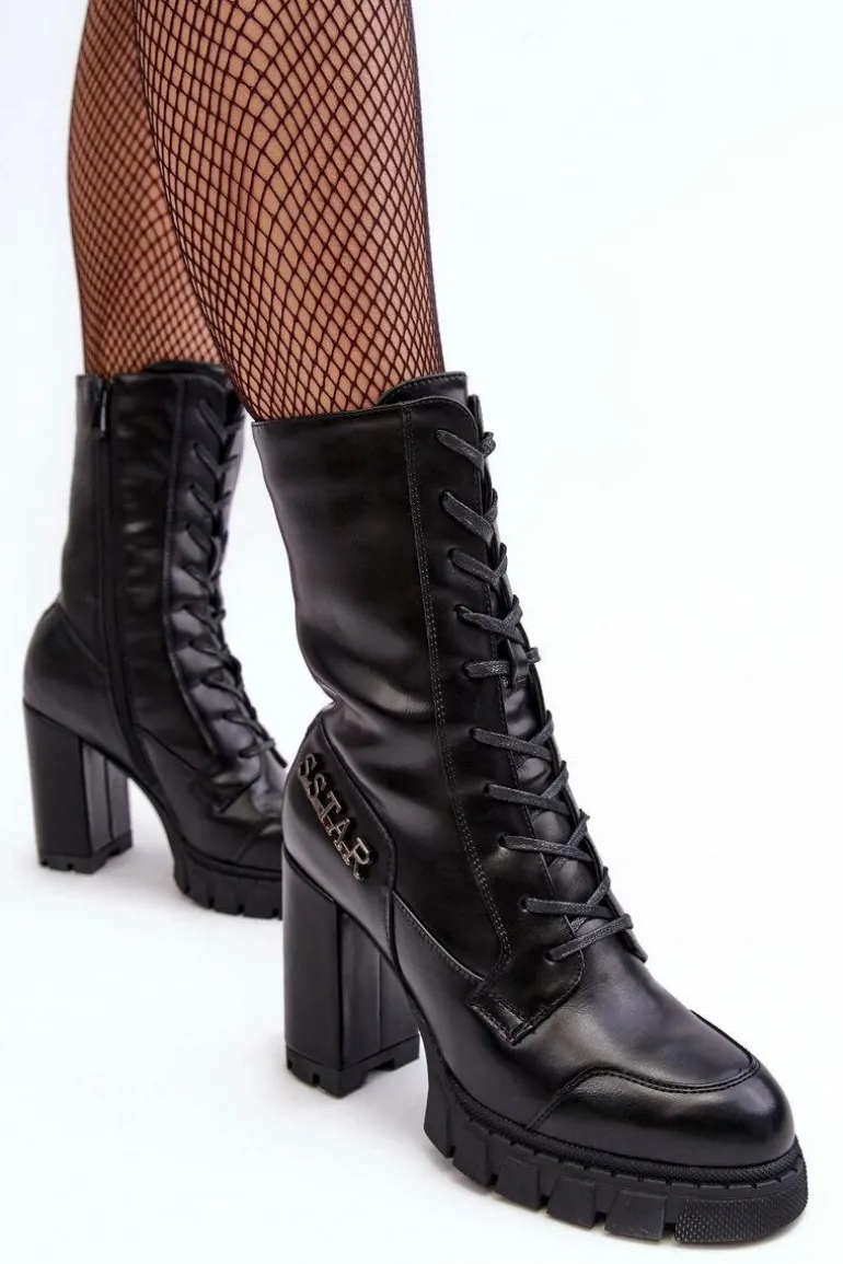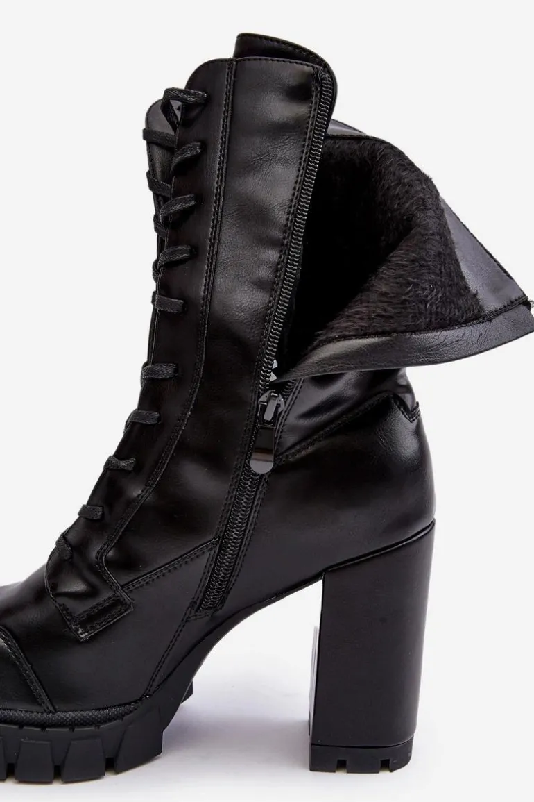 Botki damskie wykonane z eko zamszu. Zapinanie na suwak po wewnętrznej stronie cholewki. Z przodu sznurowanie. Obcas w postaci wysokiego słupka. Model z wyższą cholewką. Środek ocieplony kocem obuwniczym. Dodatkowo zapiętek jest usztywniony. Przy wyborze rozmiaru prosimy sugerować się tabelą rozmiarów.