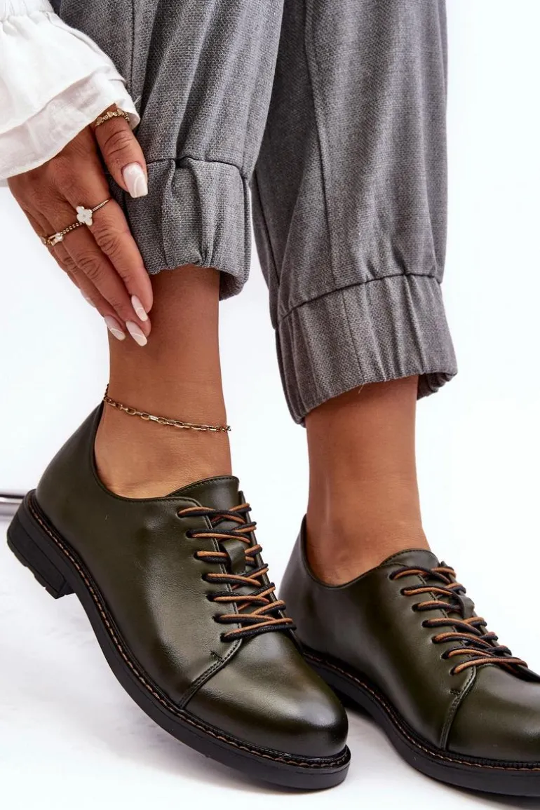 Modne półbuty damskie wykonane z eko skóry. Osadzone na płaskim, stabilnym obcasie. Noski zaokrąglone. Zapiętek jest usztywniony. Wkładka ze skóry naturalnej zapewni komfort podczas użytkowania obuwia. Model klasycznie sznurowany. Buty te sprawdzą się w wielu jesiennych stylizacjach! Koniecznie sprawdź całą naszą kolekcję półbutów! Przy wyborze rozmiaru prosimy sugerować się tabelą rozmiarów.