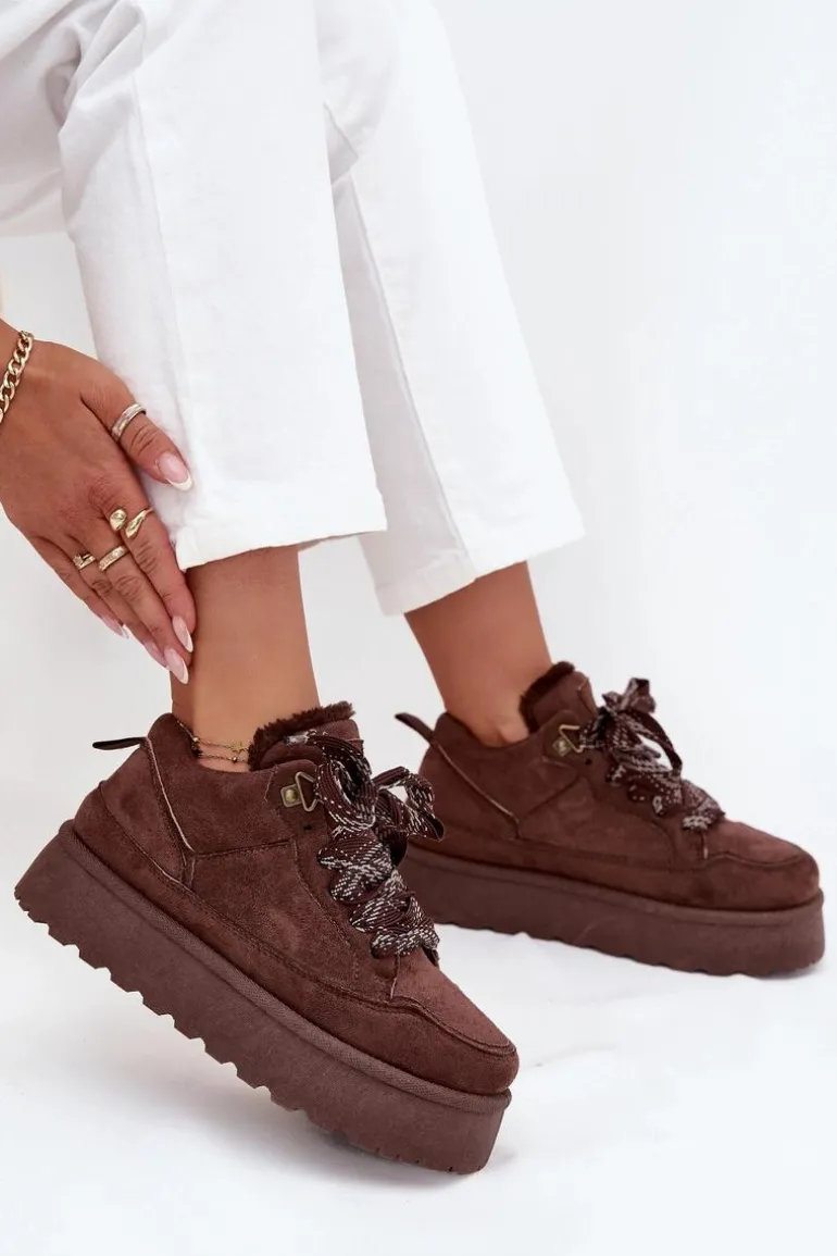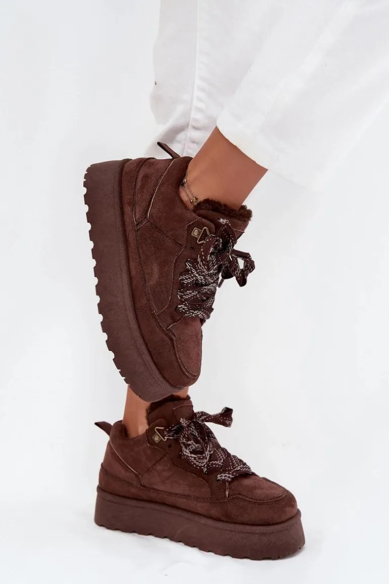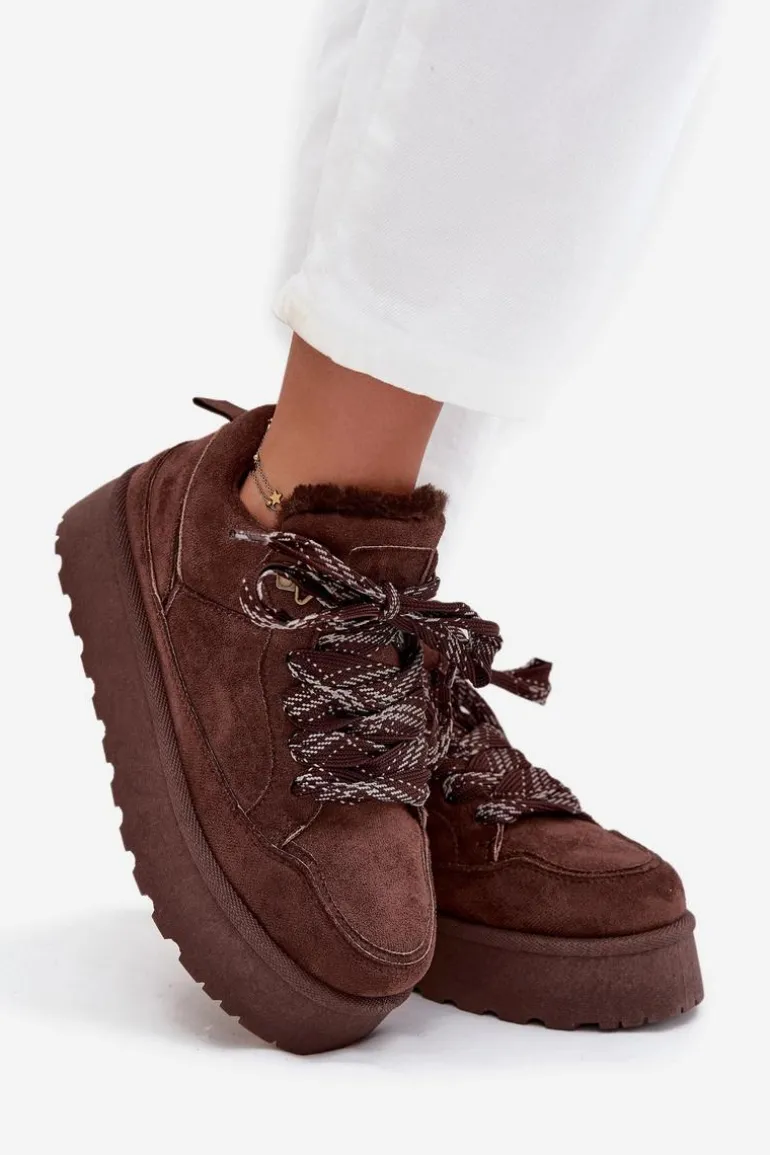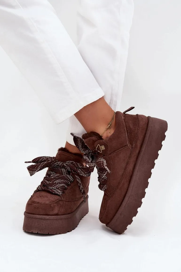 Sznurowane Śniegowce Damskie Na Platformie Ocieplane Futerkiem Brązowe Tavelle