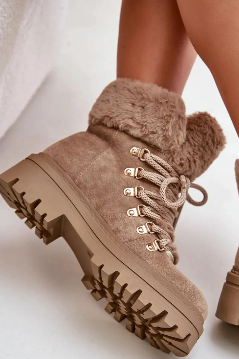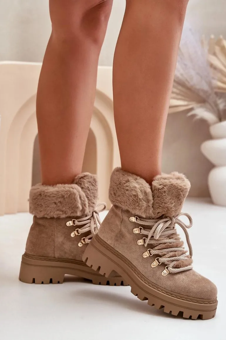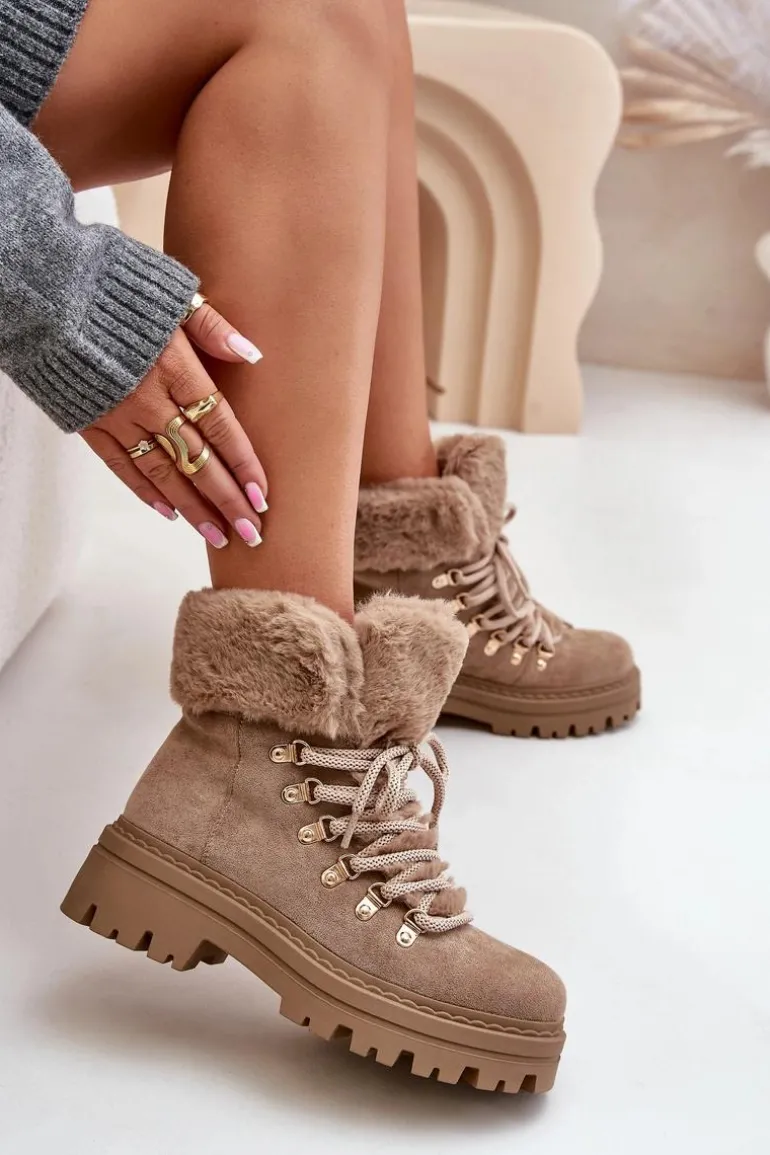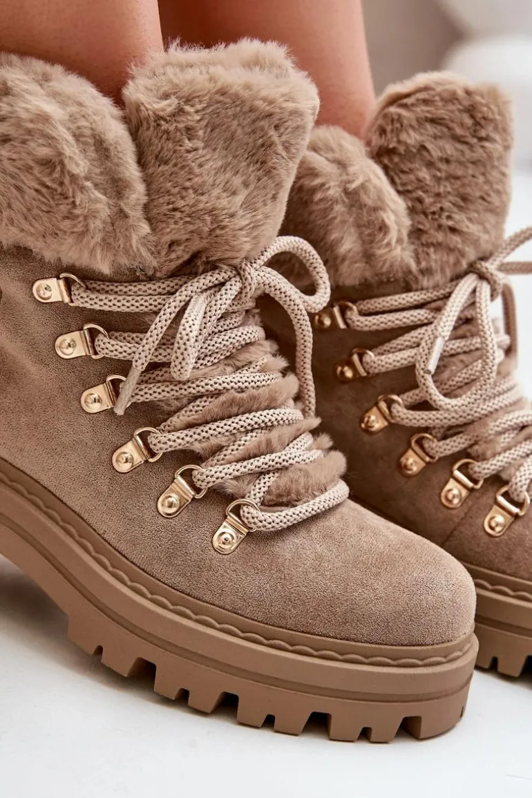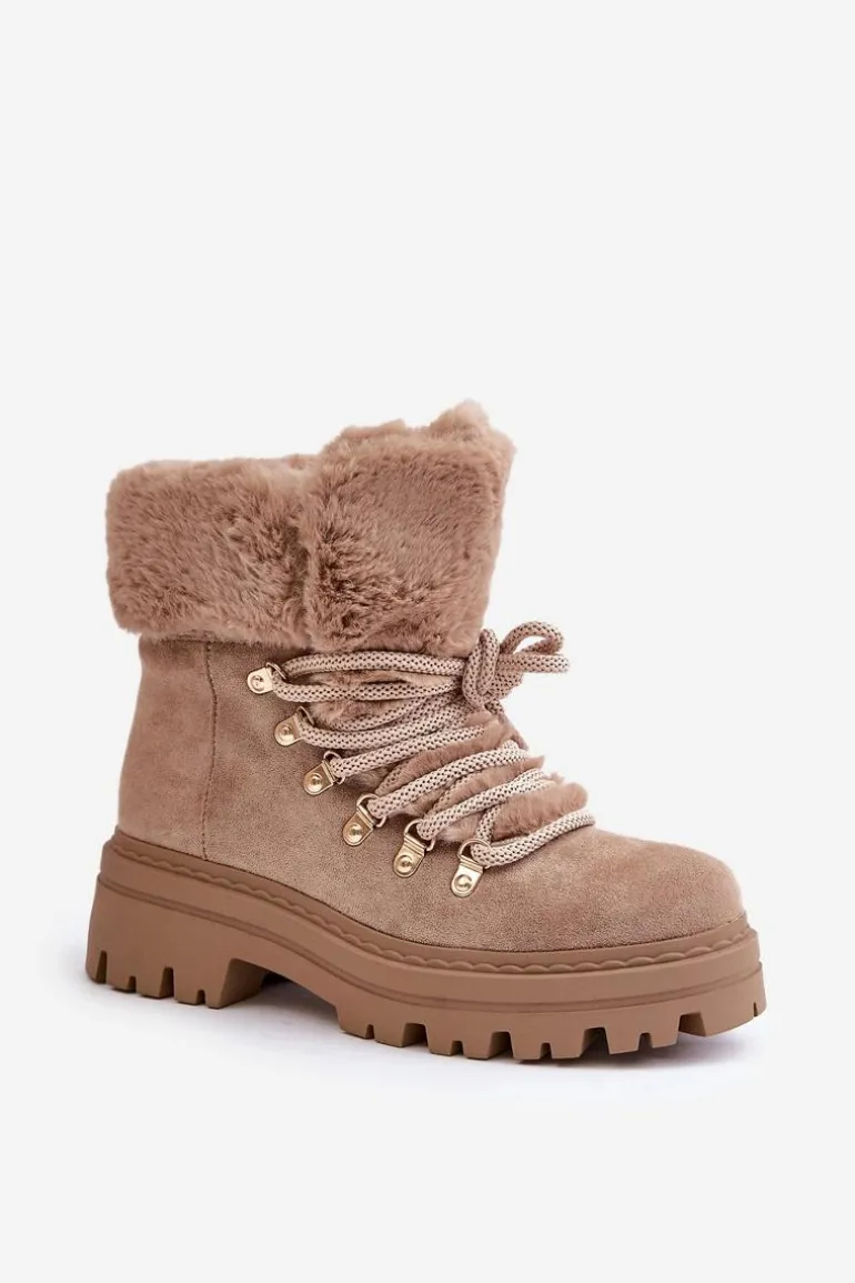 Trapery damskie wykonane z eko zamszu to doskonały wybór na chłodne dni. Sznurowanie pozwala na precyzyjne dopasowanie buta do stopy, zapewniając wygodę podczas codziennego użytkowania. Wnętrze ocieplane kocem obuwniczym gwarantuje ciepło i komfort nawet w mroźne dni. Górna część cholewki została ozdobiona miękkim futerkiem, które nie tylko dodaje stylu, ale również chroni przed zimnem. Te trapery łączą w sobie funkcjonalność i modny wygląd, idealnie sprawdzając się zarówno w miejskich stylizacjach, jak i podczas zimowych spacerów. Przy wyborze rozmiaru prosimy sugerować się tabelą rozmiarów.