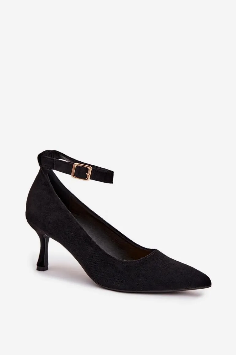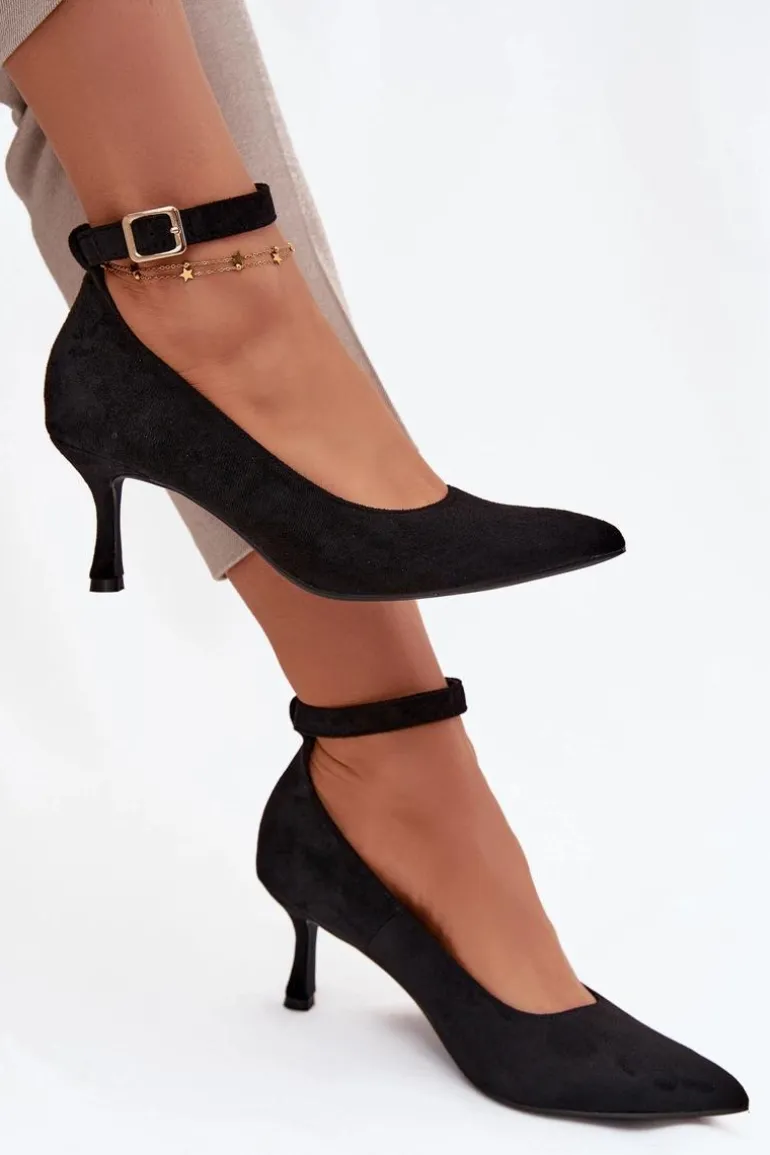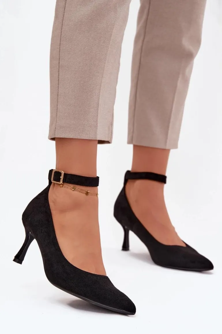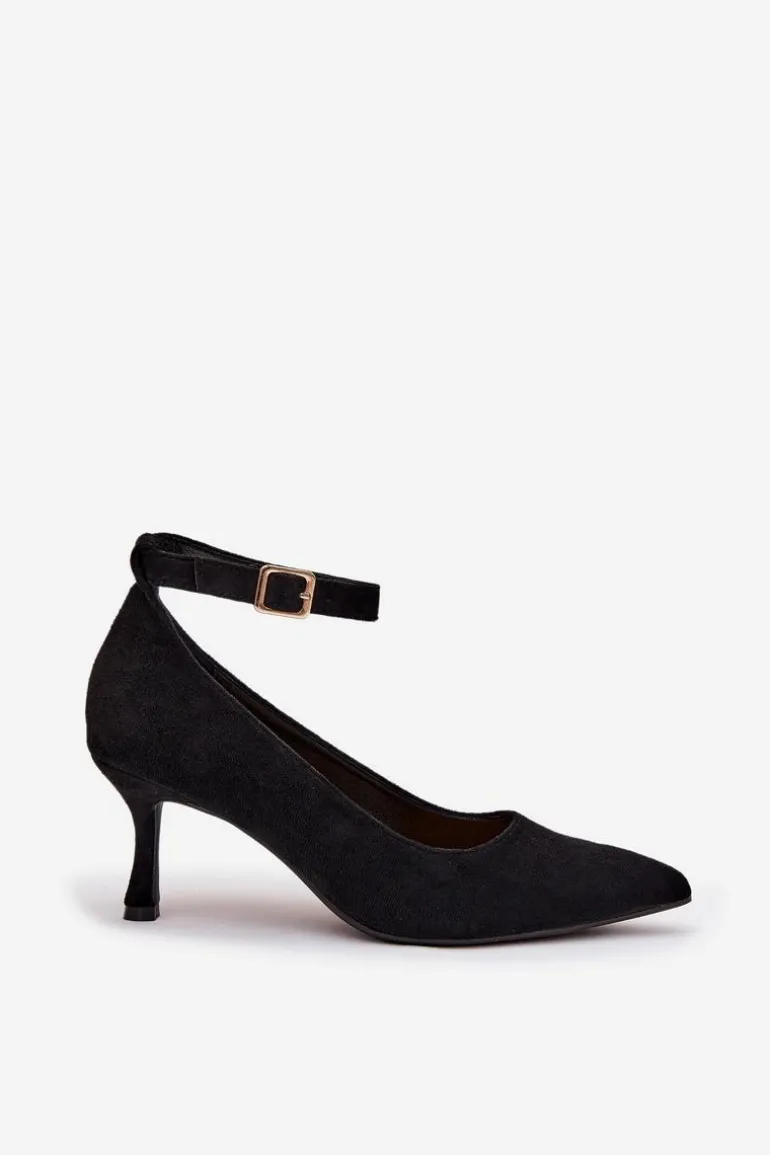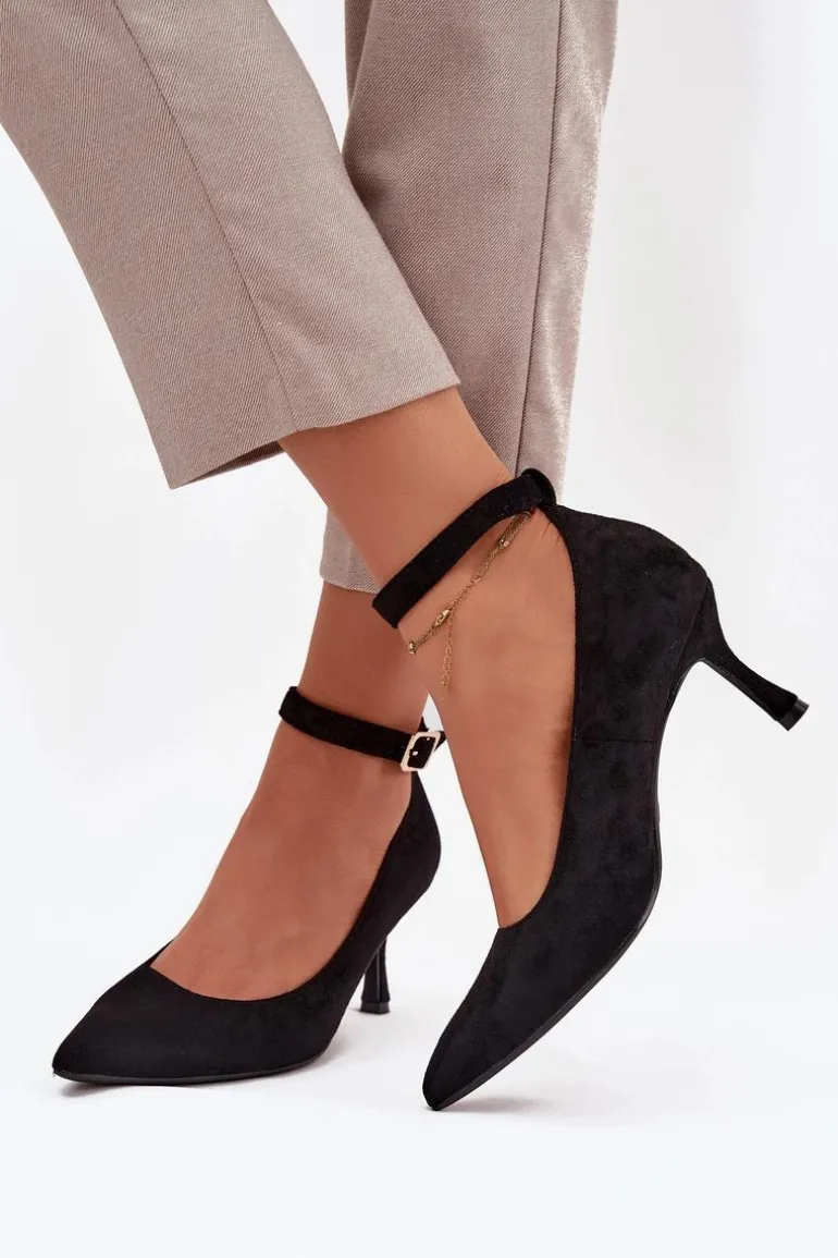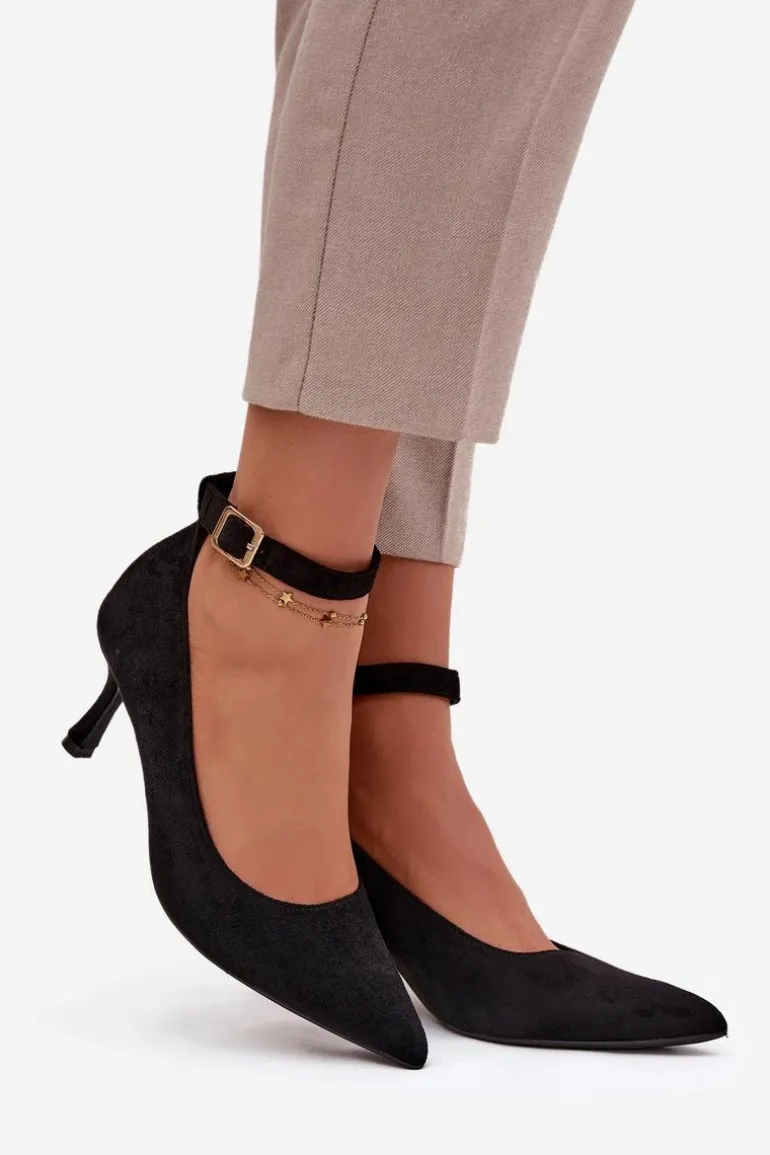 Czółenka – szpilki damskie wykonane z miękkiego eko zamszu. Model zachwyca klasycznym fasonem ze szpiczastym noskiem, który optycznie wysmukla nogi i dodaje sylwetce lekkości. Buty zapinane wokół kostki na regulowany pasek ze sprzączką pięknie podkreślają stopę, zapewniając jednocześnie stabilność i komfort podczas noszenia. Te czółenka doskonale sprawdzą się zarówno w stylizacjach wieczorowych, jak i eleganckich zestawach na co dzień.