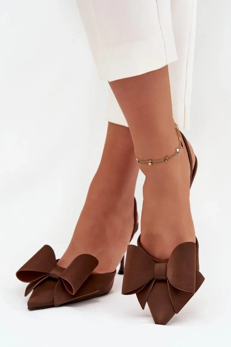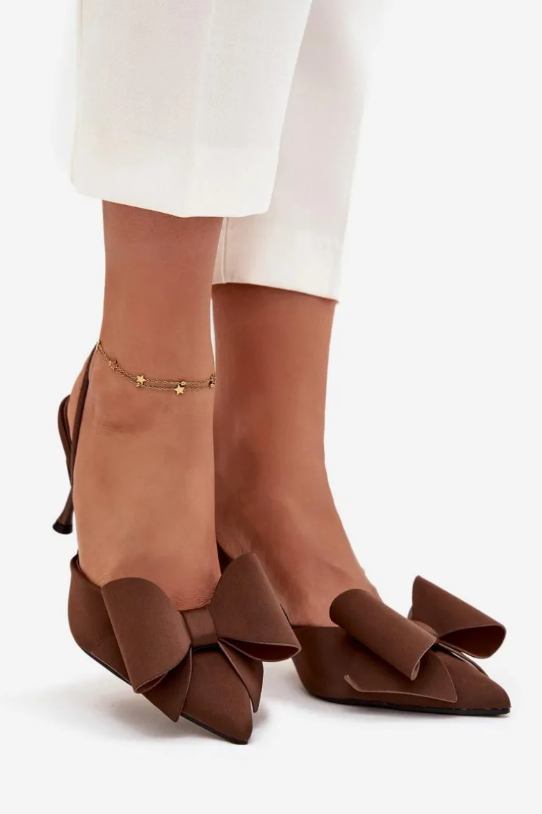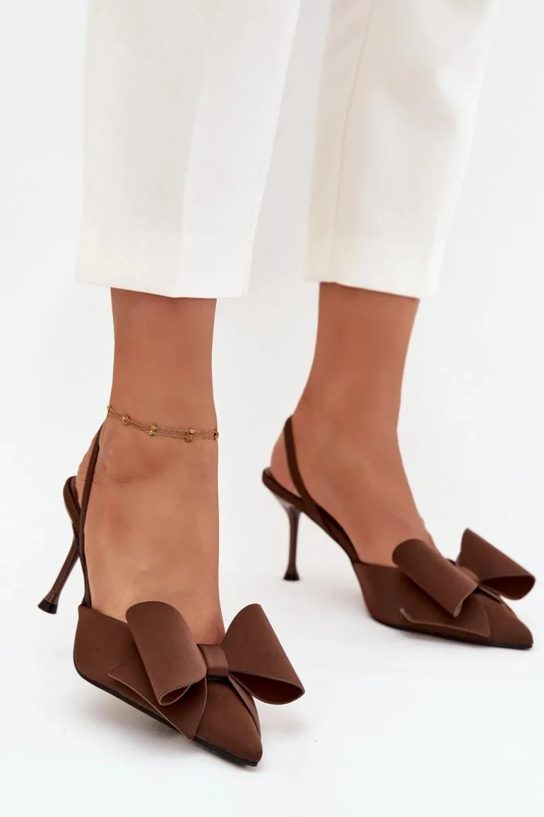 Eleganckie szpilki damskie z odkrytą piętą stanowią doskonały wybór dla kobiet, które pragną połączyć styl z komfortem. Wykonane z materiału tekstylnego. Szpiczaste noski podkreślają ich delikatną elegancję, a kokardka umieszczona z przodu dodaje im dodatkowego wdzięku. Świetnie sprawdzą się na różnorodne okazje, od oficjalnych spotkań po wieczorne wyjścia. Przy wyborze rozmiaru prosimy sugerować się tabelą rozmiarów.