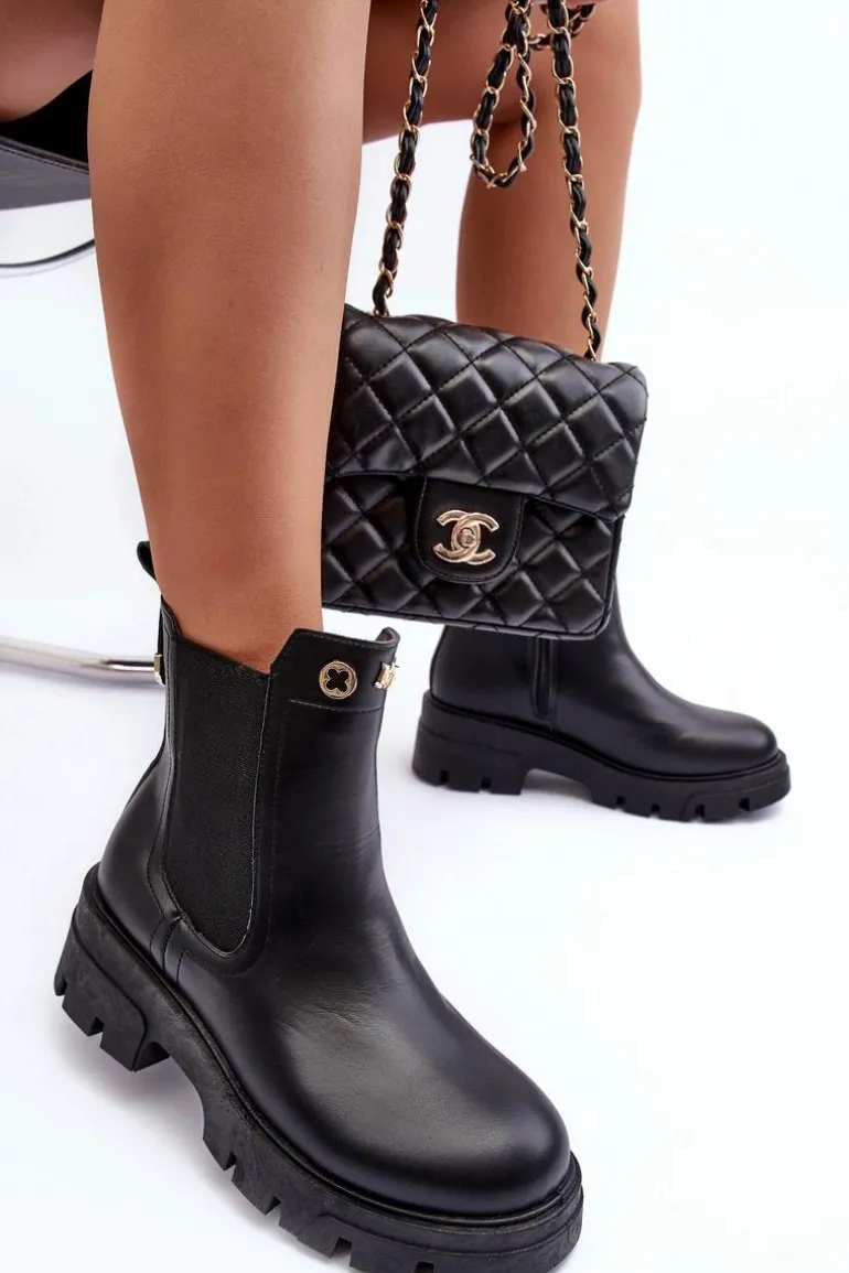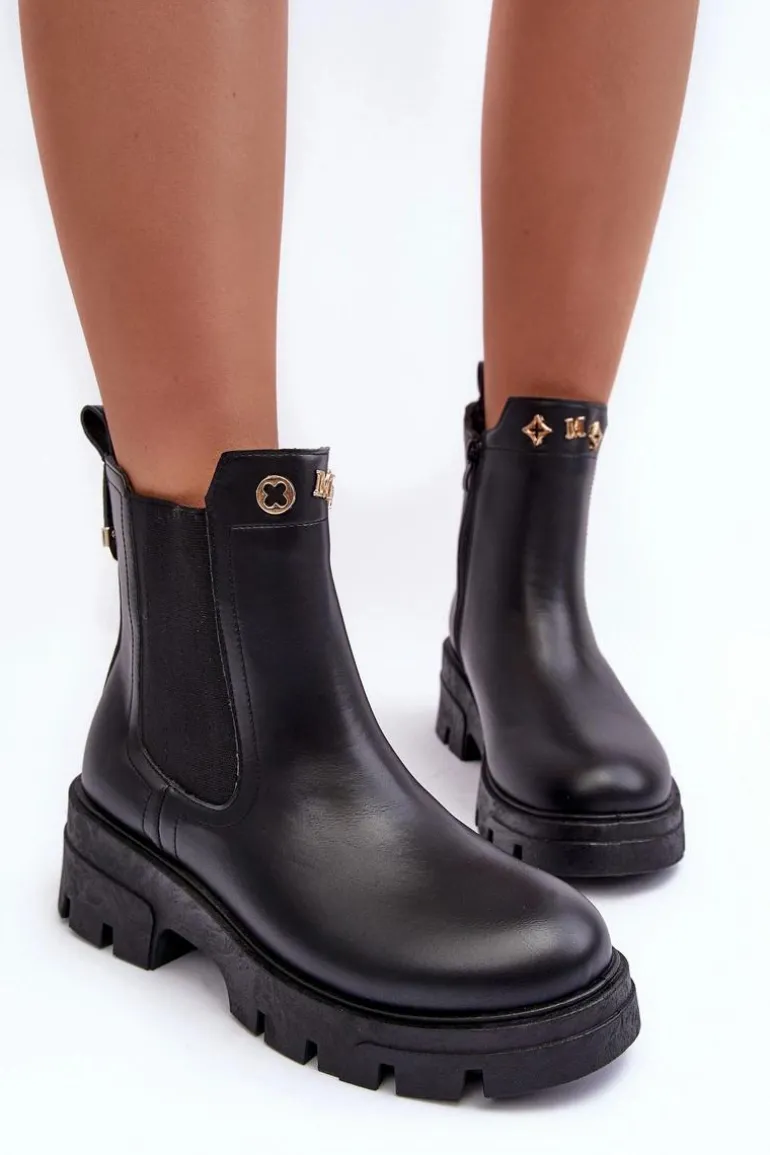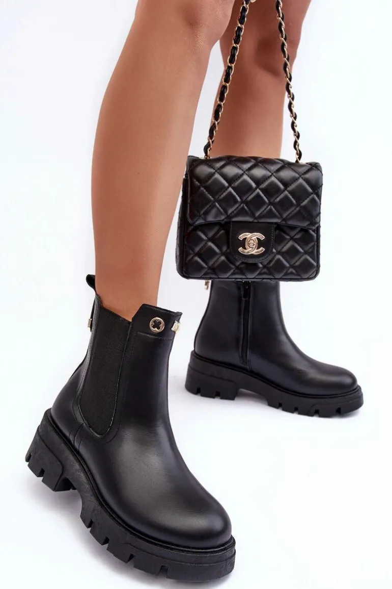 Klasyczne damskie botki osadzone na masywnym, płaskim obcasie oraz platformie. Wykonane z eko skóry. Wnętrze ocieplone kocem obuwniczym. Model zapinany na suwak. Na górze cholewki małe, złote ozdoby z tworzywa sztucznego. Koniecznie powinnaś mieć ten model w swojej szafie! Przy wyborze rozmiaru prosimy sugerować się tabelą rozmiarów.