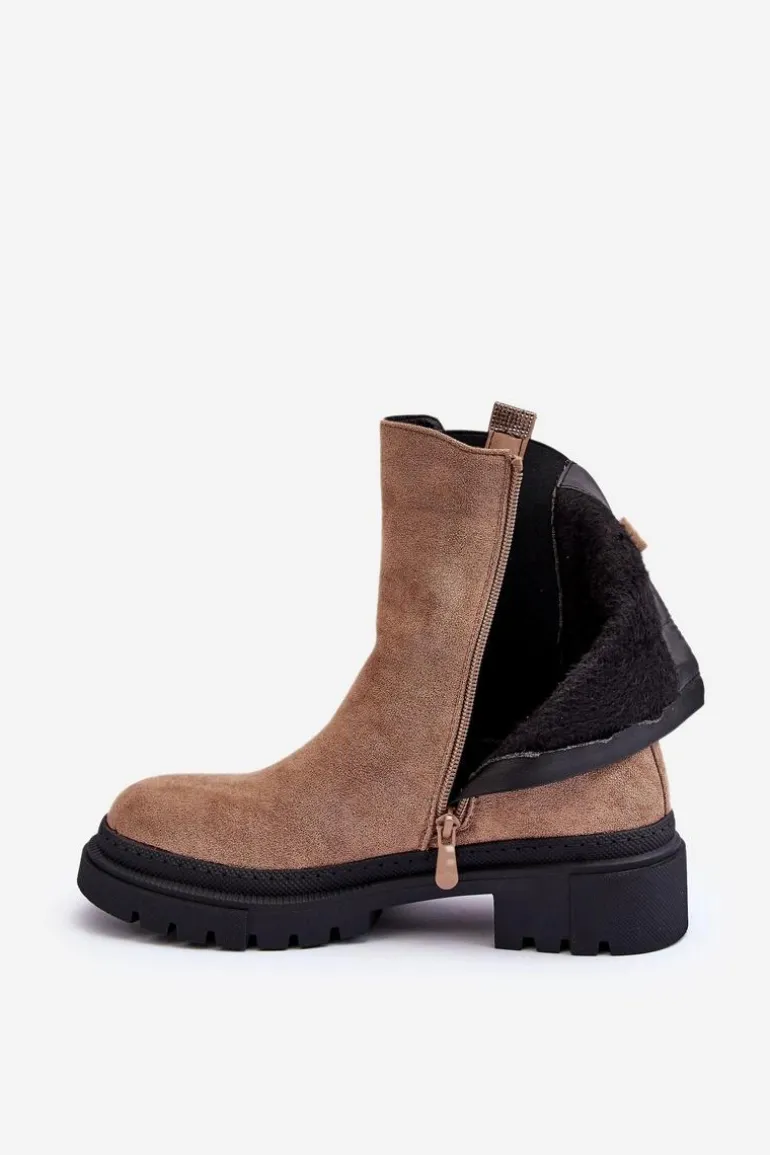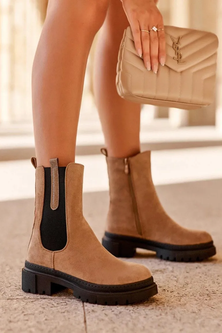 Damskie sztyblety osadzone na płaskim, stabilnym obcasie oraz platformie. Model ten wykonany jest z eko zamszu. Zapinany na suwak po wewnętrznej stronie cholewki. Na elastycznej wstawce znajduje się zdobienie w postaci małych, błyszczących dżetów. Zapiętek jest usztywniony, wnętrze ocieplone kocem obuwniczym. Przy wyborze rozmiaru prosimy sugerować się tabelą rozmiarów.