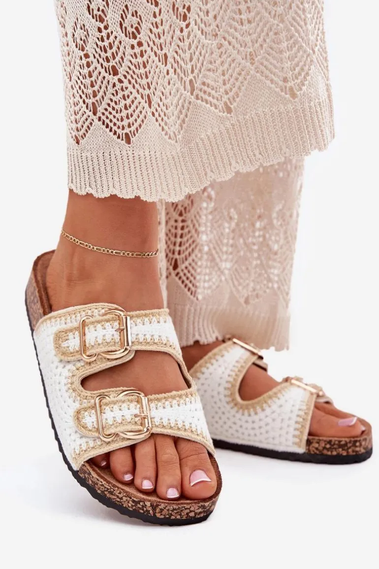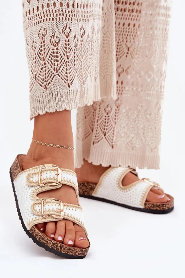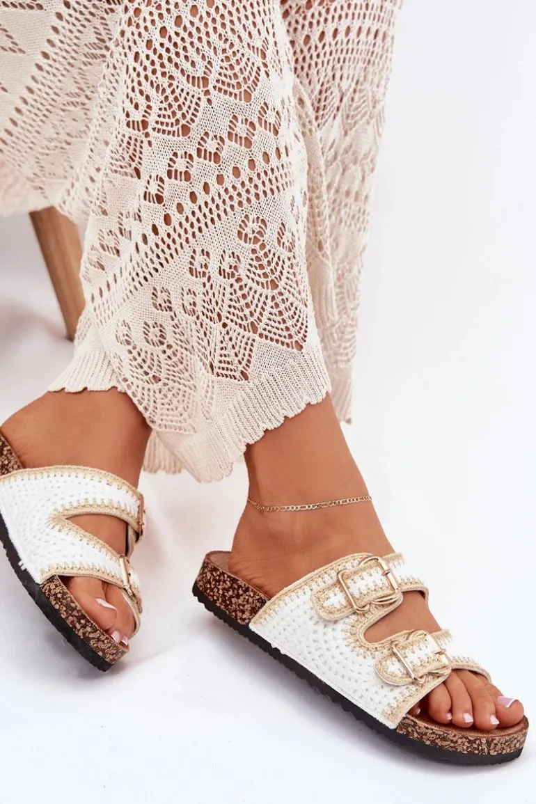 Szydełkowe klapki damskie na korkowej platformie to wyjątkowa propozycja na ciepłe dni. Dzięki profilowanej wkładce z eko zamszu zapewniają komfort i wygodę przez cały dzień. Dwie złote klamry dodają im eleganckiego charakteru. Idealne do letnich stylizacji, te klapki będą doskonałym wyborem do sukienek, spódnic i spodni. Przy wyborze rozmiaru prosimy sugerować się tabelą rozmiarów.