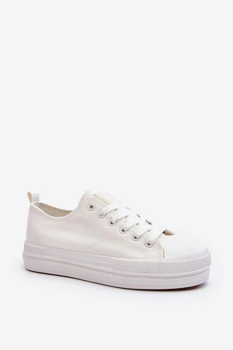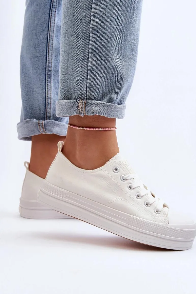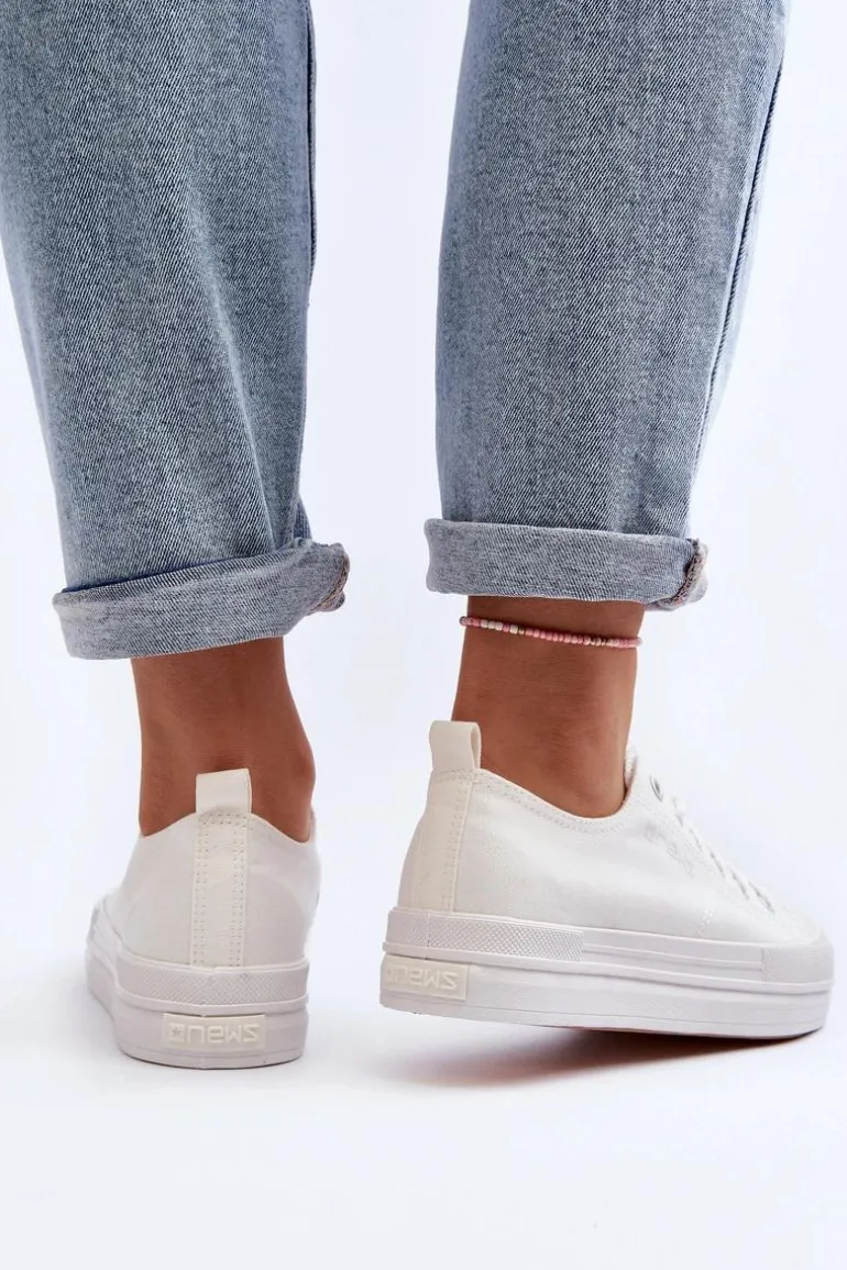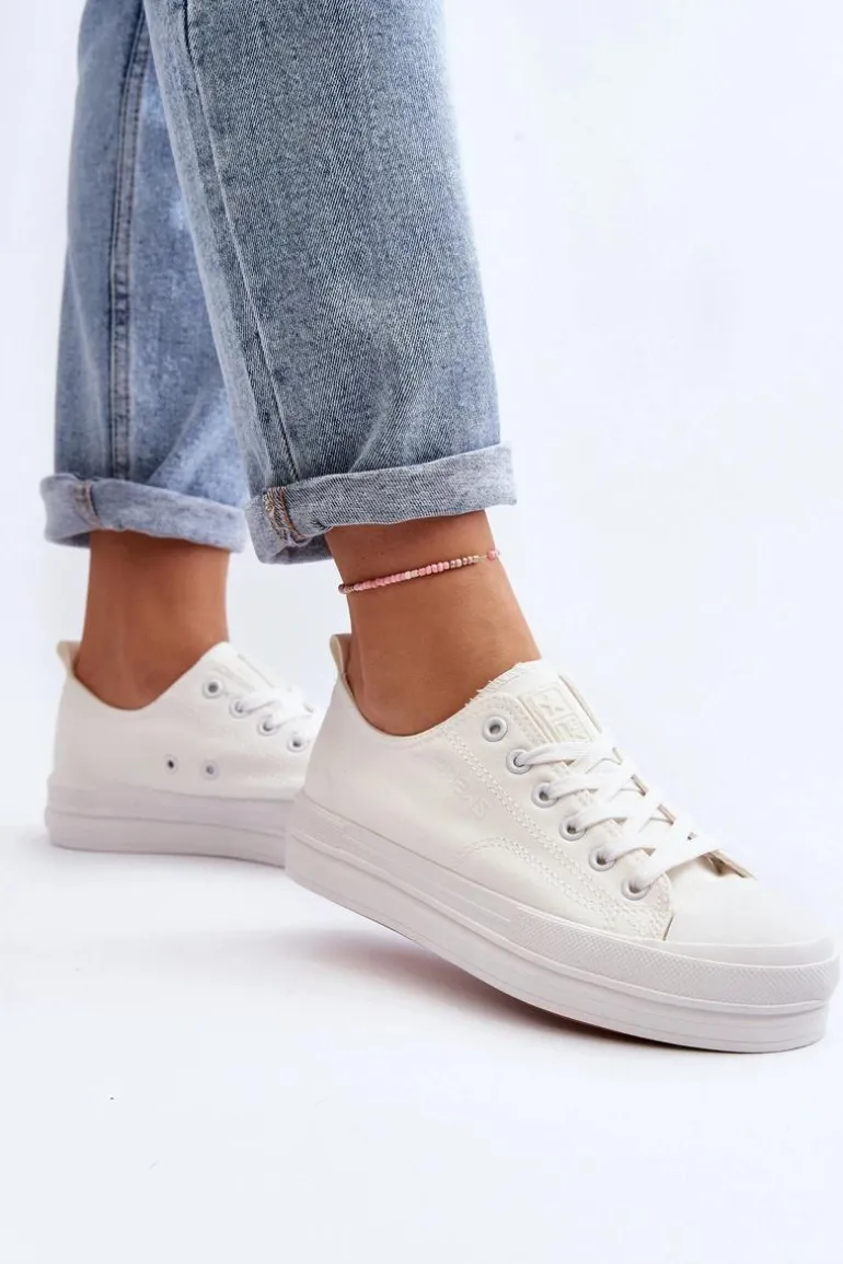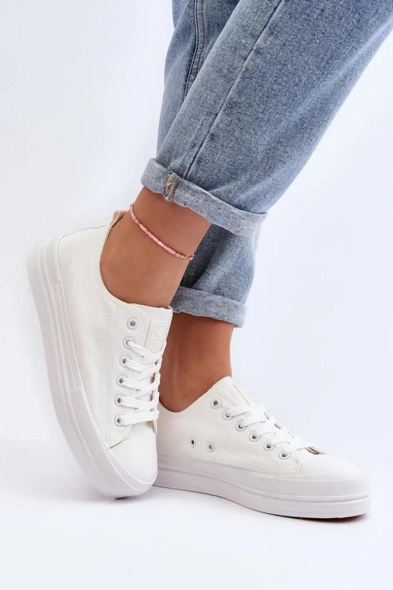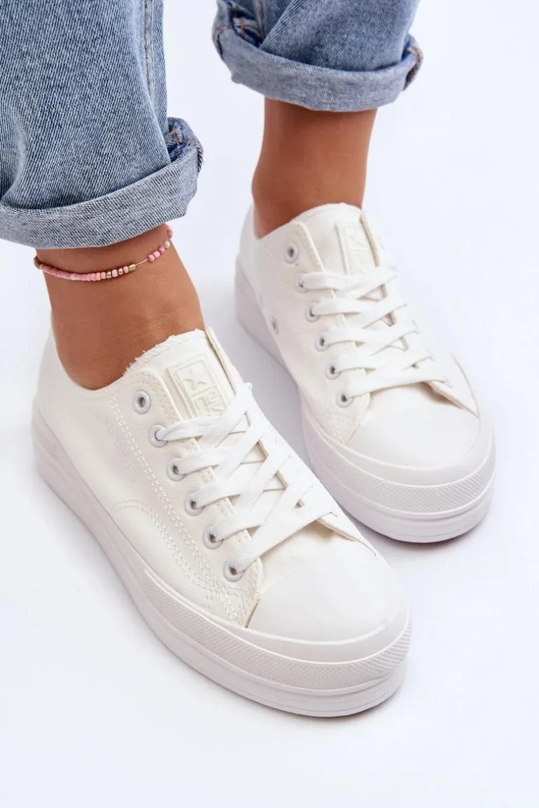 Trampki damskie wykonane z materiału tekstylnego. Osadzone na platformie. Gumowa podeszwa jest antypoślizgowa. Ponadczasowy model, który powinnaś mieć w swojej szafie! Z pewnością założysz je do wielu stylizacji! Nosek został wzmocniony gumowym tworzywem. Przy wyborze rozmiaru prosimy sugerować się tabelą rozmiarów.