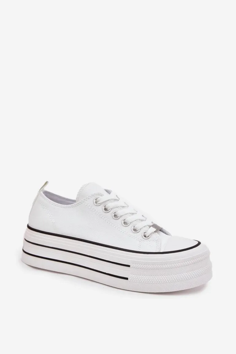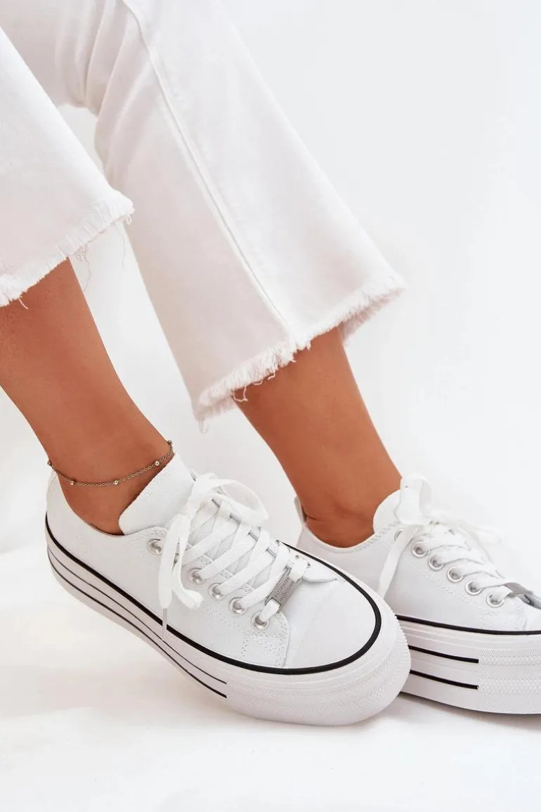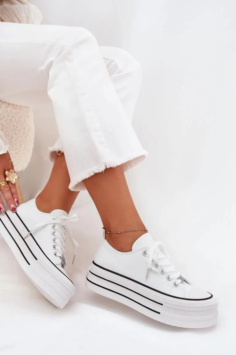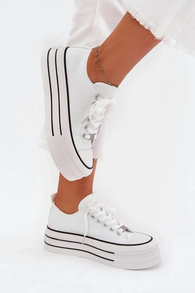 Trampki damskie wykonane z materiału tekstylnego, osadzone na masywnej platformie, która optycznie wysmukla sylwetkę. Niska cholewka i klasyczne sznurowanie zapewniają wygodę oraz idealne dopasowanie. Stylowy fason sprawia, że te trampki doskonale komponują się z codziennymi stylizacjami. Przy wyborze rozmiaru prosimy sugerować się tabelą rozmiarów.