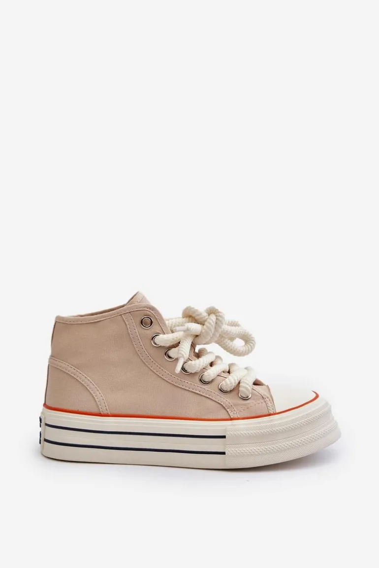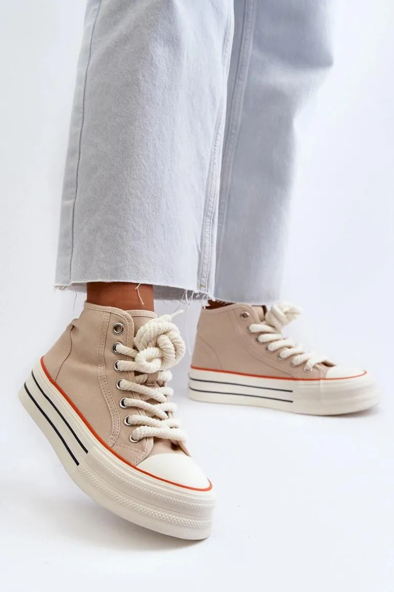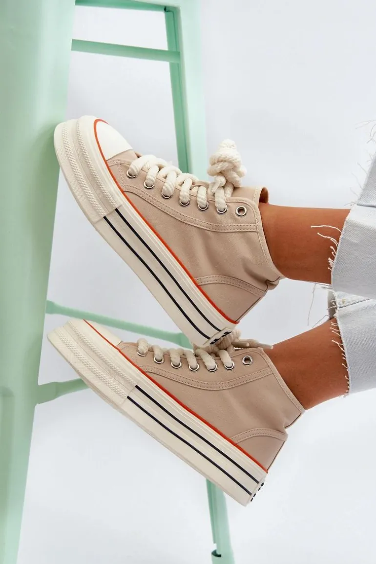 Trampki damskie wykonane z materiału tekstylnego. Masywna platforma z gumowego tworzywa dodaje im modnego wyglądu oraz zapewnia stabilność podczas chodzenia. Zaokrąglone noski oraz klasyczne sznurowanie sprawiają, że są uniwersalnym dodatkiem do wielu casualowych stylizacji. Niezależnie od tego, czy idziesz na spacer po mieście czy spotkanie ze znajomymi, te trampki będą doskonałym wyborem. Przy wyborze rozmiaru prosimy sugerować się tabelą rozmiarów.