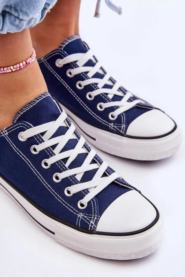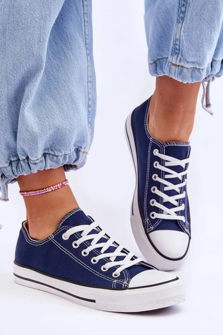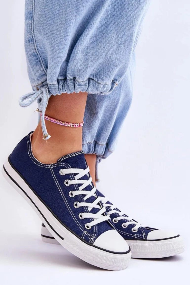 Klasyczne, sznurowane trampki damskie zostały wykonane z materiału tekstylnego. Posiadają gumową podeszwę, która jest dodatkowo antypoślizgowa. Ponadczasowy model, który powinnaś mieć w swojej szafie! Z pewnością założysz je do wielu stylizacji! Nosek został wzmocniony gumowym tworzywem. Wygodna, materiałowa wkładka zapewni komfort podczas użytkowania. Przy wyborze rozmiaru prosimy sugerować się tabelą rozmiarów.