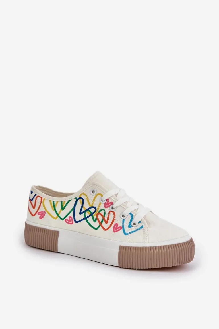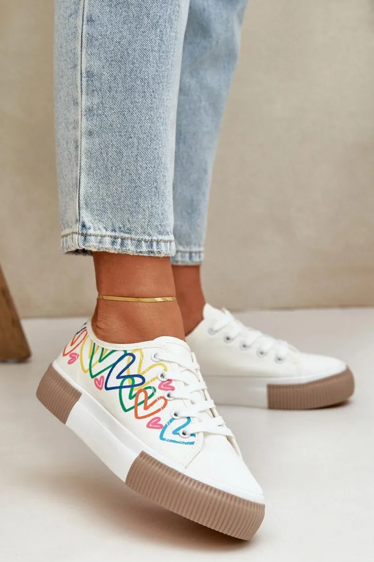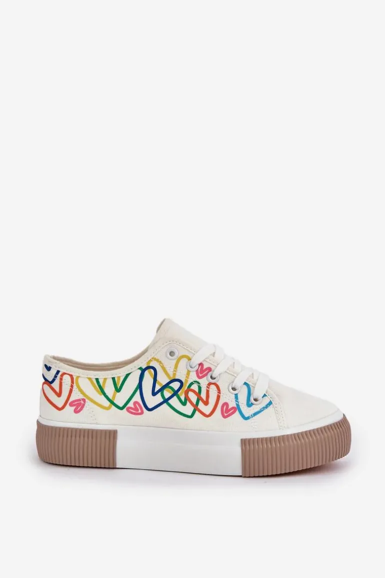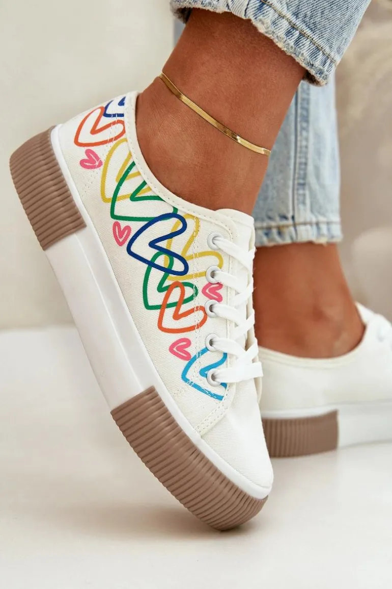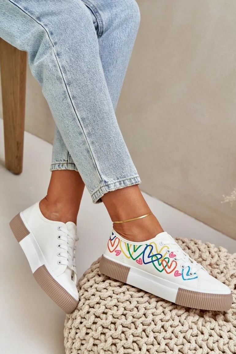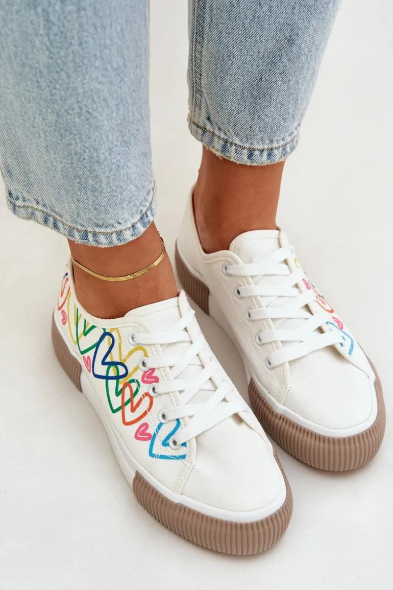 Damskie trampki wykonane z tkaniny to idealna propozycja dla miłośniczek wygody i stylu. Model osadzony na grubszej podeszwie zapewnia komfort noszenia oraz świetnie wpisuje się w najnowsze trendy. Zaokrąglone noski nadają im klasycznego wyglądu, a nadruk serca na cholewce dodaje uroku i oryginalności. Idealne zarówno do codziennych, jak i bardziej casualowych stylizacji! Przy wyborze rozmiaru prosimy sugerować się tabelą rozmiarów.