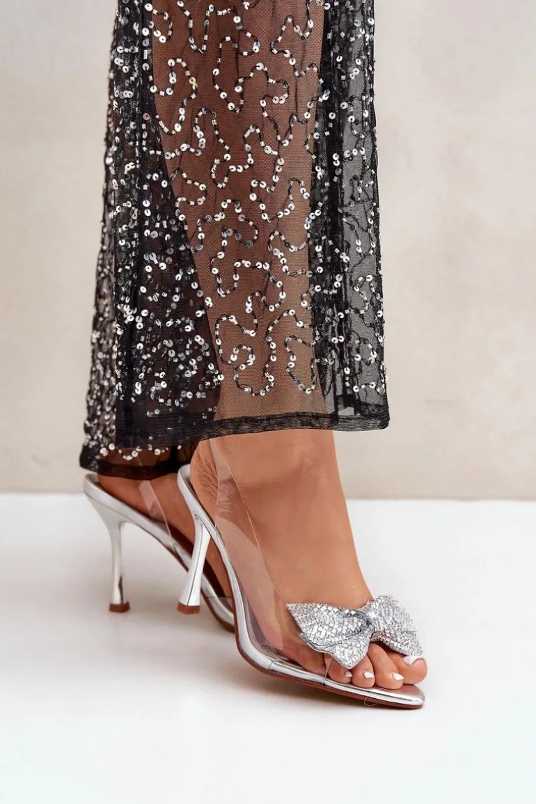 Eleganckie transparentne sandały na szpilce, które idealnie podkreślą wyjątkowy charakter Twojej stylizacji. Model wyróżnia się efektowną, błyszczącą kokardą z przodu, dodającą odrobinę glamour. Model ten doskonale komponują się z sukniami koktajlowymi oraz eleganckimi kompletami, tworząc szykowny i modny look. Przy wyborze rozmiaru prosimy sugerować się tabelą rozmiarów.
