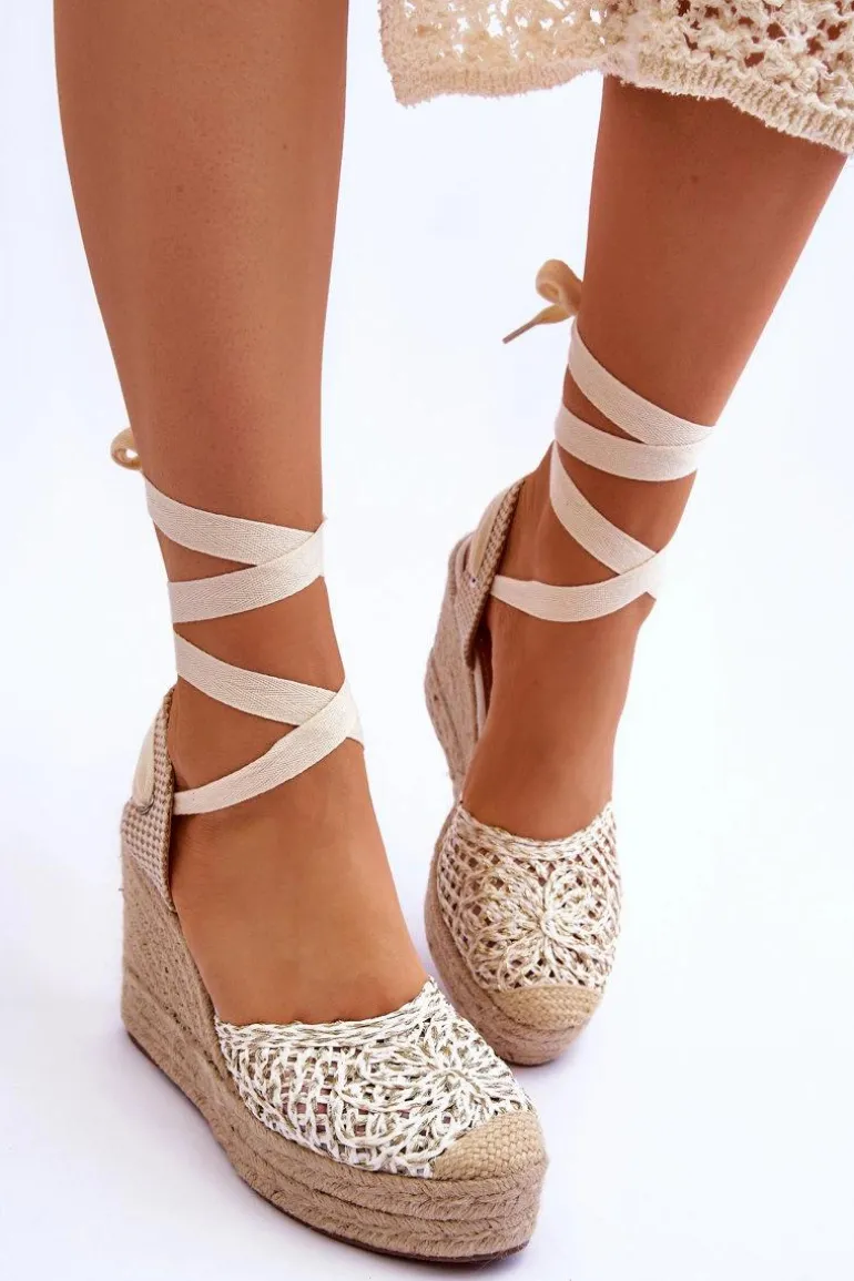 Modne i wygodne sandały osadzone na obcasie w postaci koturnu ozdobionego jutową plecionką. Sandały posiadają antypoślizgową podeszwę wykonaną z gumowego tworzywa. Cholewka została wykonana z połączenia tkaniny oraz tworzywa sztucznego. Sandałki posiadają wiązanie wokół kostki. Wkładka z eko skóry pozwala na komfortowe użytkowanie obuwia. Przy wyborze rozmiaru prosimy sugerować się tabelą rozmiarów.