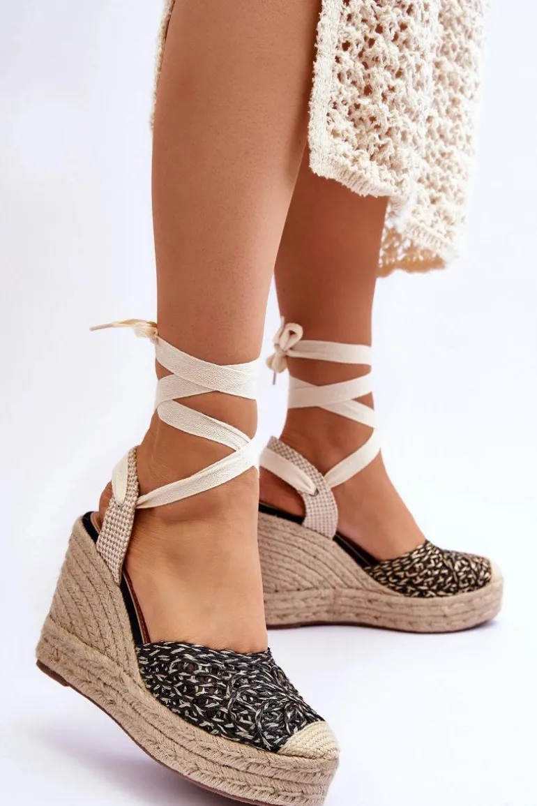 Modne i wygodne sandały osadzone na obcasie w postaci koturnu ozdobionego jutową plecionką. Sandały posiadają antypoślizgową podeszwę wykonaną z gumowego tworzywa. Cholewka została wykonana z połączenia tkaniny oraz tworzywa sztucznego. Sandałki posiadają wiązanie wokół kostki. Wkładka z eko skóry pozwala na komfortowe użytkowanie obuwia. Przy wyborze rozmiaru prosimy sugerować się tabelą rozmiarów.