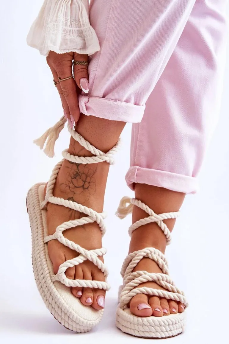 Wygodne sandałki zostały wykonane z miękkiej tkaniny. Posiadają paski w formie sznureczków zakończonych frędzelkami. Sandałki są wiązane wokół łydki. Dodatkowo posiadają miękką wkładkę wykonaną z tkaniny. Model ten został osadzony na platformie. Sandałki świetnie sprawdzą się w stylizacjach boho. Przy wyborze rozmiaru prosimy sugerować się tabelą rozmiarów.