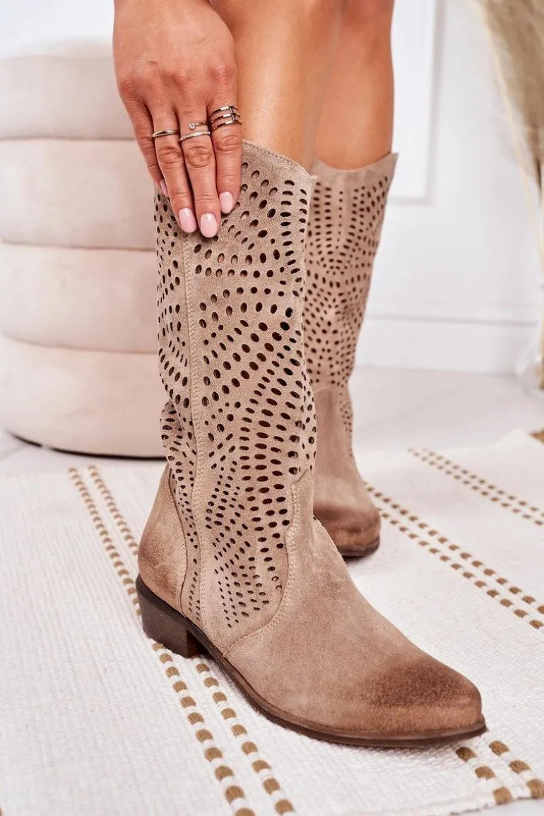 Wiosenne Ażurowe Kozaki Zamszowe Exquisite 1229 Beżowe