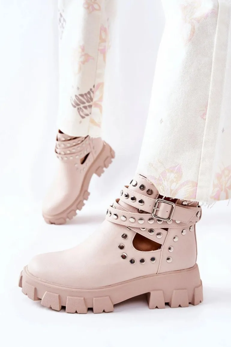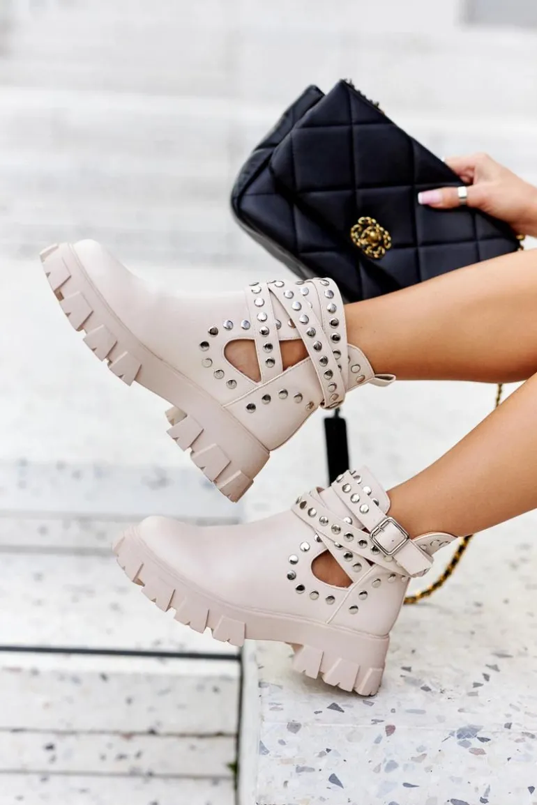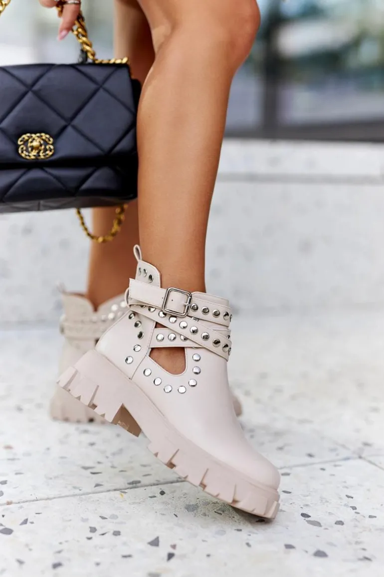Wierzch botków wykonany jest ze skóry ekologicznej, natomiast wnętrze pokryte jest materiałem tekstylnym. Botki są wsuwane. Posiadają sprzączkę z regulowanym paskiem. Cholewka jest przyozdobiona dżetami, a na jej całości znajdują się efektowne wycięcia. Sprawdź pozostałą naszą kolekcję botków! Przy wyborze rozmiaru prosimy sugerować się tabelą rozmiarów.