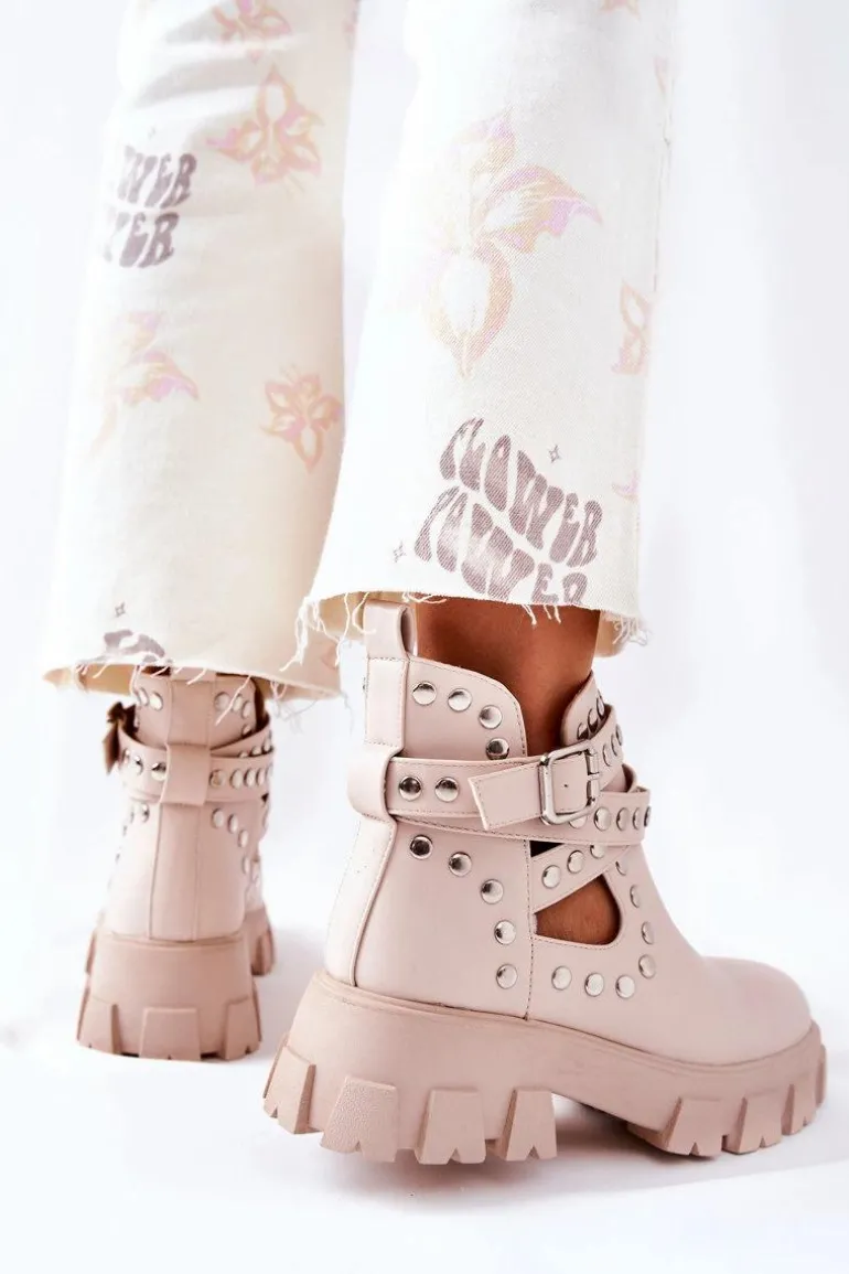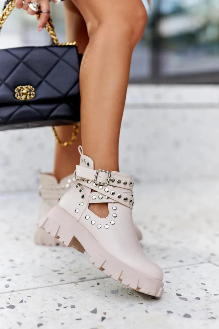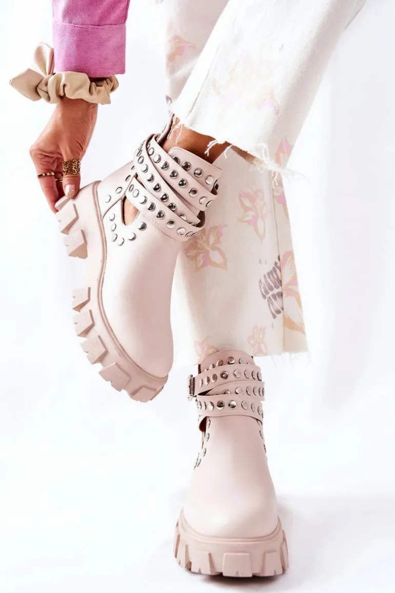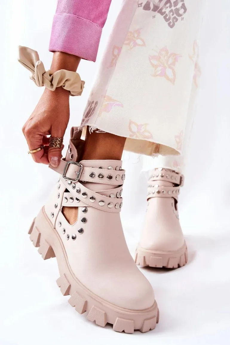 Wierzch botków wykonany jest ze skóry ekologicznej, natomiast wnętrze pokryte jest materiałem tekstylnym. Botki są wsuwane. Posiadają sprzączkę z regulowanym paskiem. Cholewka jest przyozdobiona dżetami, a na jej całości znajdują się efektowne wycięcia. Sprawdź pozostałą naszą kolekcję botków! Przy wyborze rozmiaru prosimy sugerować się tabelą rozmiarów.