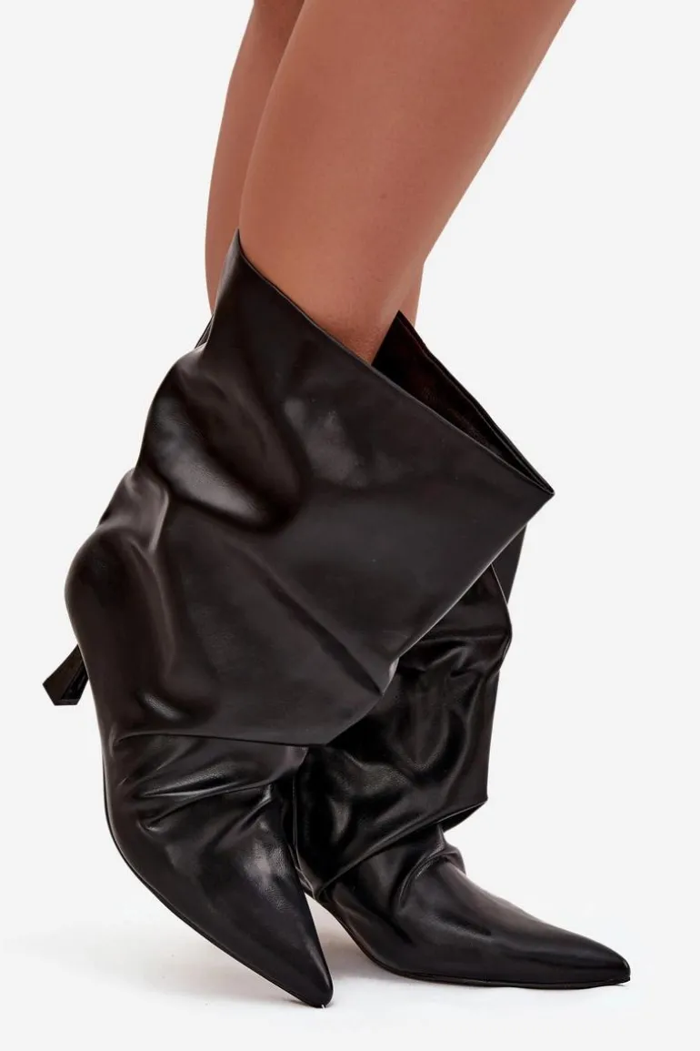 Botki damskie wykonane z eko skóry to stylowy model, który łączy elegancję z modnym akcentem. Osadzone na smukłej szpilce, pięknie podkreślają sylwetkę i dodają kobiecego wdzięku. Wsuwany fason zapewnia wygodę zakładania, a szeroka, marszczona cholewka nadaje im wyjątkowego, nowoczesnego charakteru. To efektowne botki, które doskonale uzupełnią zarówno codzienne, jak i wieczorowe stylizacje. Przy wyborze rozmiaru prosimy sugerować się tabelą rozmiarów.