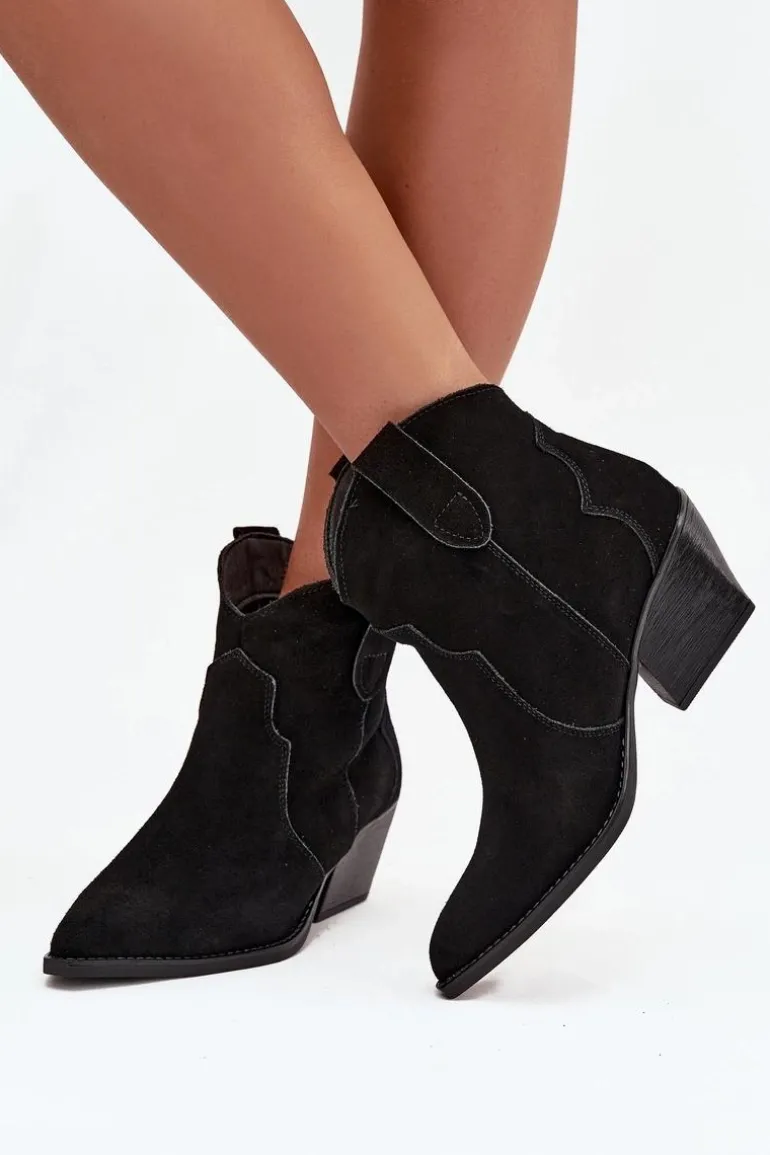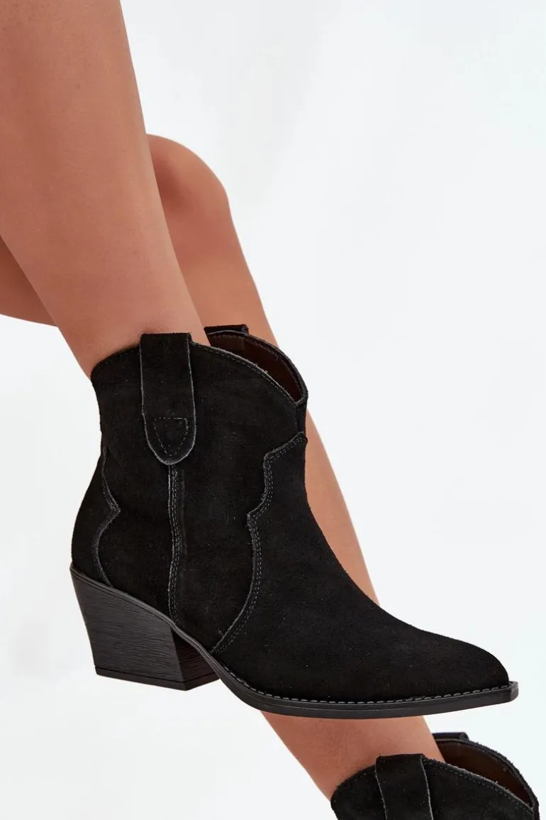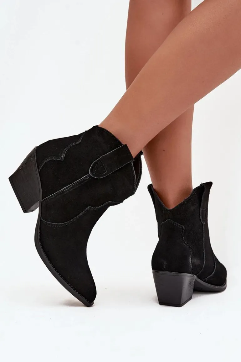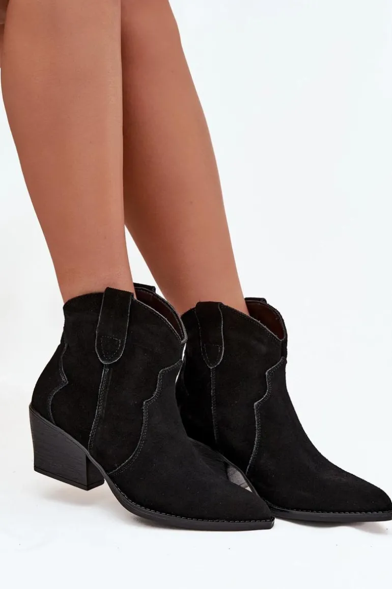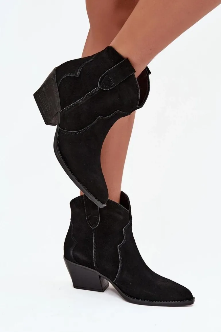 Botki damskie wykonane z naturalnego zamszu to stylowe obuwie w kowbojskim klimacie, które doda charakteru każdej stylizacji. Model wsuwany zapewnia wygodę zakładania, a stabilny, ścięty obcas optycznie wysmukla sylwetkę i nadaje wyjątkowego wyglądu. Szpiczaste noski podkreślają kobiecy styl i nawiązują do klasycznych kowbojek, dzięki czemu botki doskonale komponują się zarówno z jeansami, jak i zwiewnymi sukienkami. Wnętrze ocieplone kocem obuwniczym gwarantuje komfort termiczny w chłodniejsze dni, sprawiając, że model jest nie tylko efektowny, ale i praktyczny. To propozycja dla kobiet ceniących modne detale i wygodę na co dzień – botki sprawdzą się świetnie w jesienno-zimowych stylizacjach, dodając im oryginalnego, westernowego charakteru.