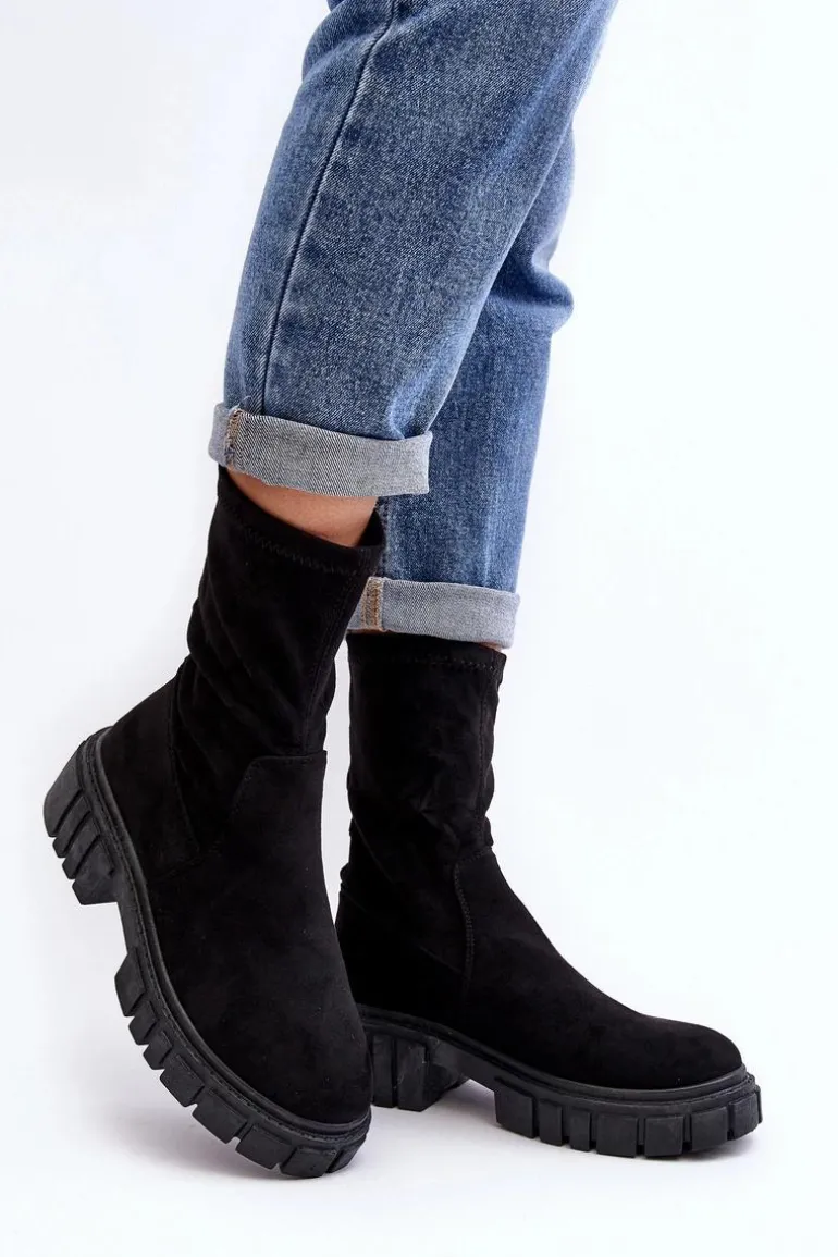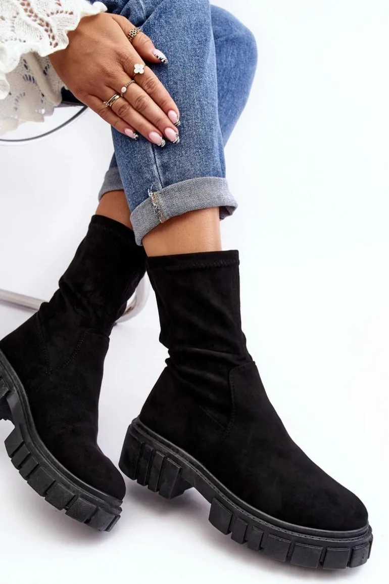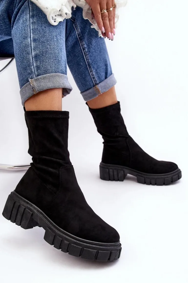 Wsuwane botki damskie wykonane z eko zamszu. Osadzone na masywnym, płaskim obcasie i platformie. Nieocieplone. Miękka wkładka zapewni komfort podczas użytkowania. Zapiętek w tym obuwiu jest usztywniany. Model ten dopasujesz do wielu jesiennych stylizacji! Przy wyborze rozmiaru prosimy sugerować się tabelą rozmiarów.