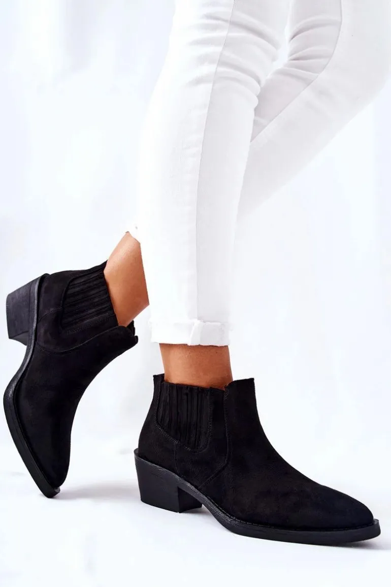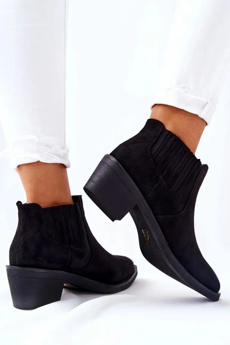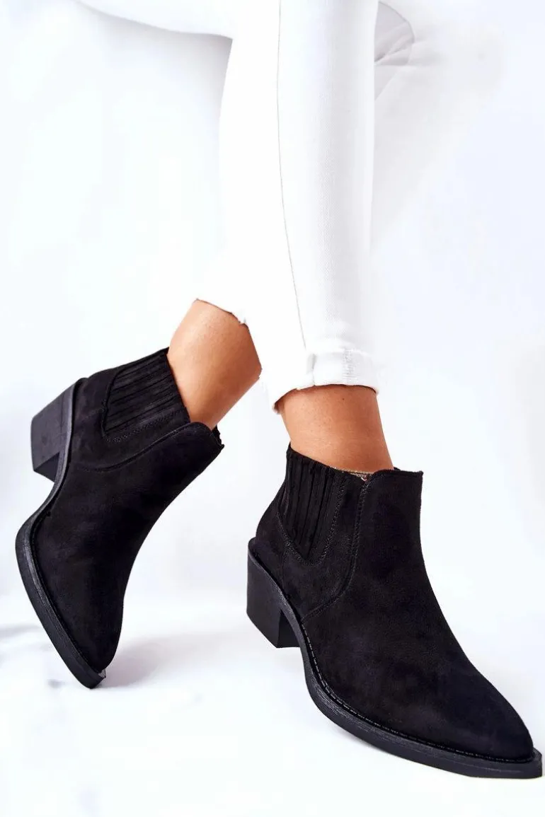 Wygodne oraz stylowe botki na masywnym słupku. Wykonane z ekologicznego zamszu. Posiadają nosek w szpic. Z boku cholewki znajduje się ściągacz po obu stronach. Botki posiadają delikatne ocieplenie w postaci koca obuwniczego. Kup je już dziś! Przy wyborze rozmiaru prosimy sugerować się tabelą rozmiarów.