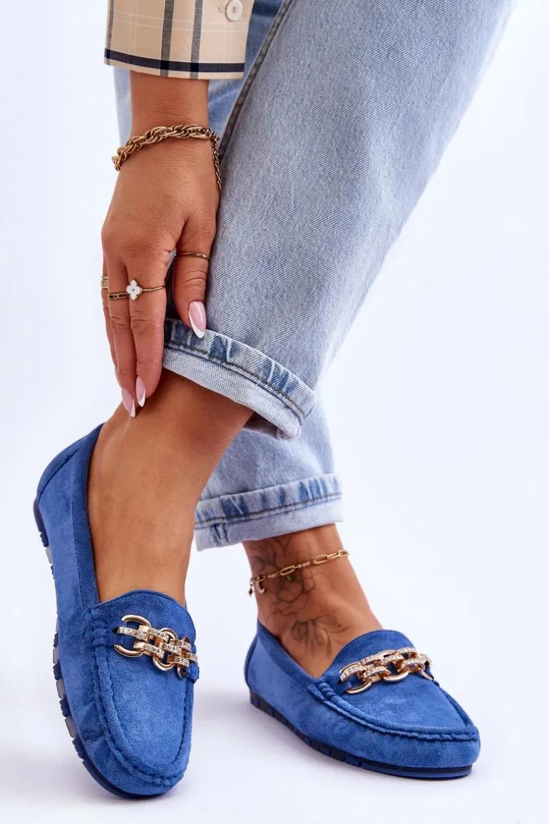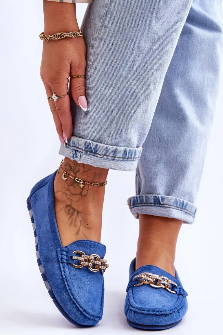 Mokasyny damskie zostały wykonane z eko zamszu. Posiadają na przodzie ozdobny łańcuszek z dżetami. Mokasyny zostały osadzone na platformie z gumową, antypoślizgową podeszwą. Miękka wkładka z eko skóry zapewni komfortowe użytkowanie. Koniecznie powinnaś je mieć! Przy wyborze rozmiaru prosimy sugerować się tabelą rozmiarów.