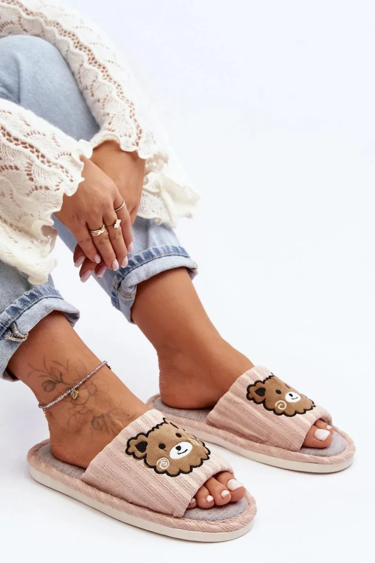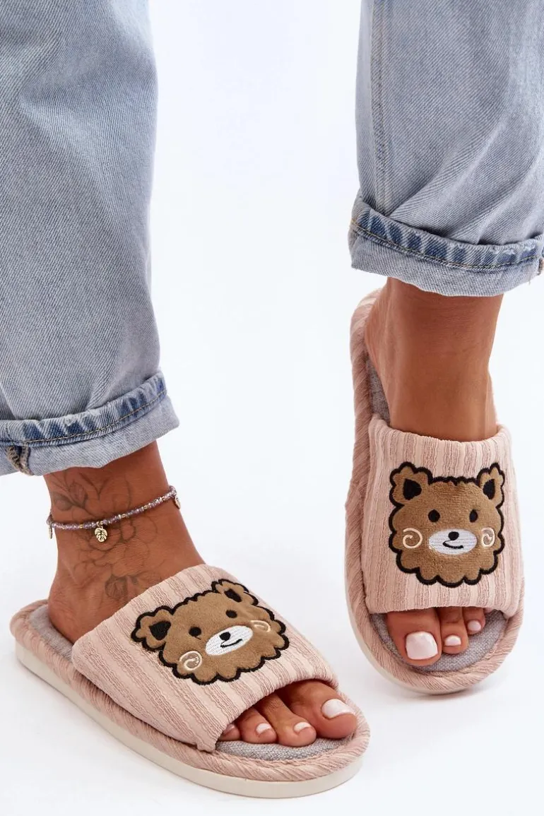 Kapcie damskie wykonane z materiału tekstylnego. Osadzone na płaskiej, gumowej podeszwie. Z przodu znajdują się naszywki misie. Noski otwarte. Idealne na relaks w domowym zaciszu! Przy wyborze rozmiaru prosimy kierować się tabelą rozmiarów.