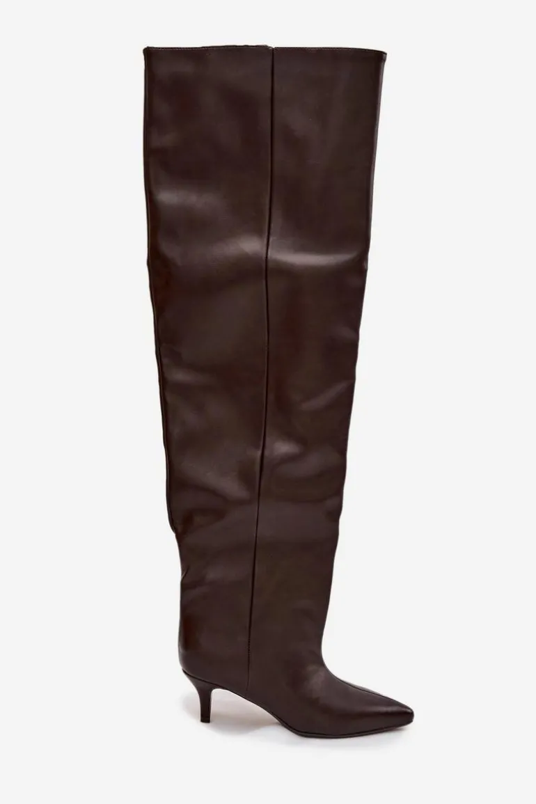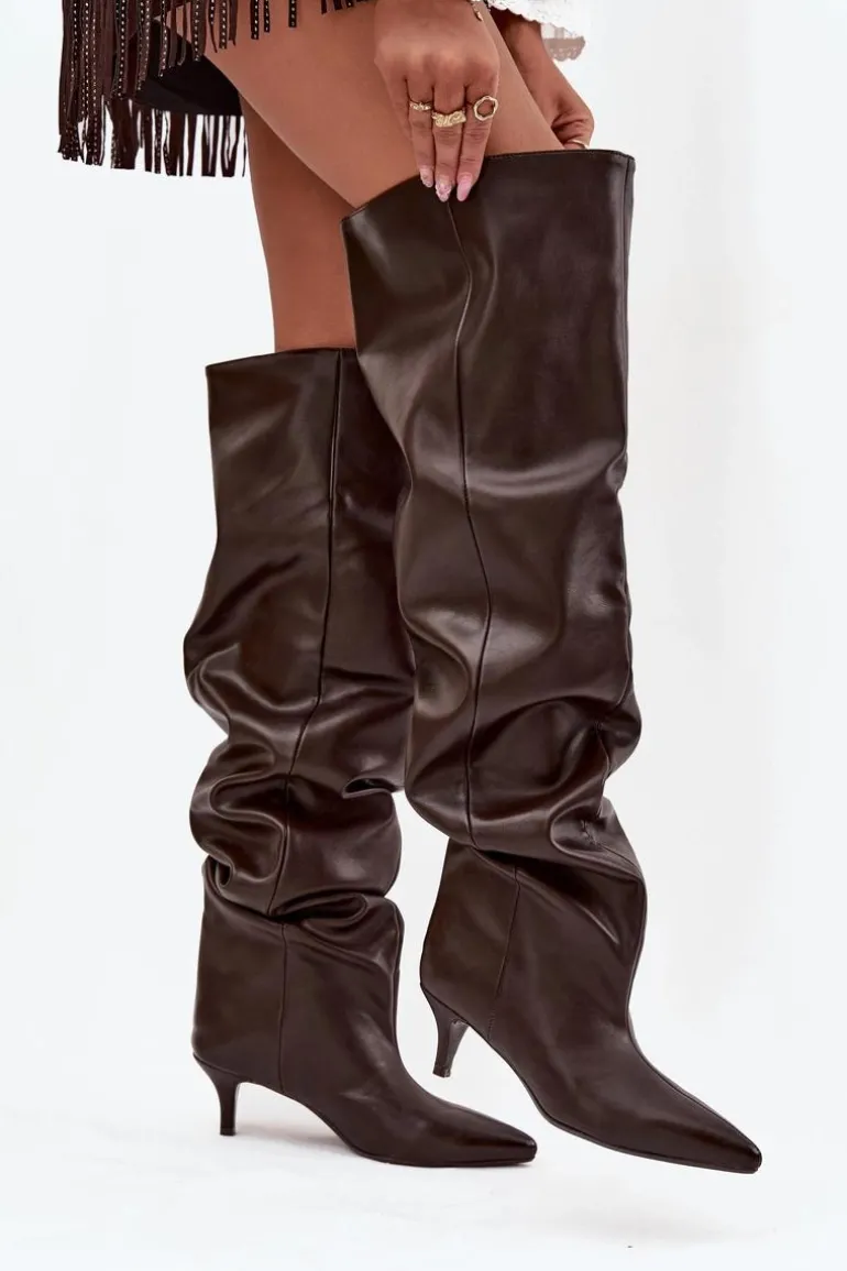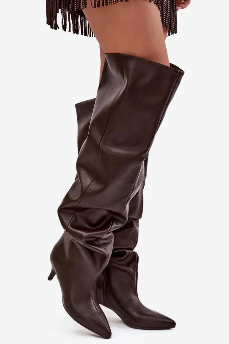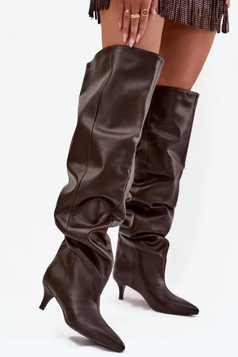 Kozaki damskie wykonane z eko skóry. Model został osadzony na niskiej szpilce. Charakterystyczną cechą butów jest szeroka cholewka, która nie tylko nadaje im modnego wyglądu, ale również sprawia, że kozaki są wygodne w noszeniu i łatwe do dopasowania do każdej nogi. Wsuwany fason ułatwia szybkie zakładanie i zdejmowanie, czyniąc obuwie praktycznym w codziennym użytkowaniu. To kozaki, które doskonale sprawdzą się zarówno w zestawieniach casualowych, jak i bardziej eleganckich stylizacjach, dodając im wyrafinowanego charakteru. Przy wyborze rozmiaru prosimy kierować tabelą rozmiarów.