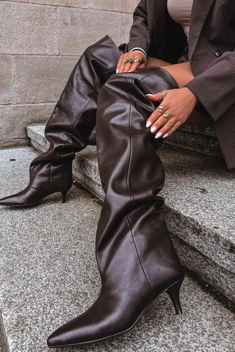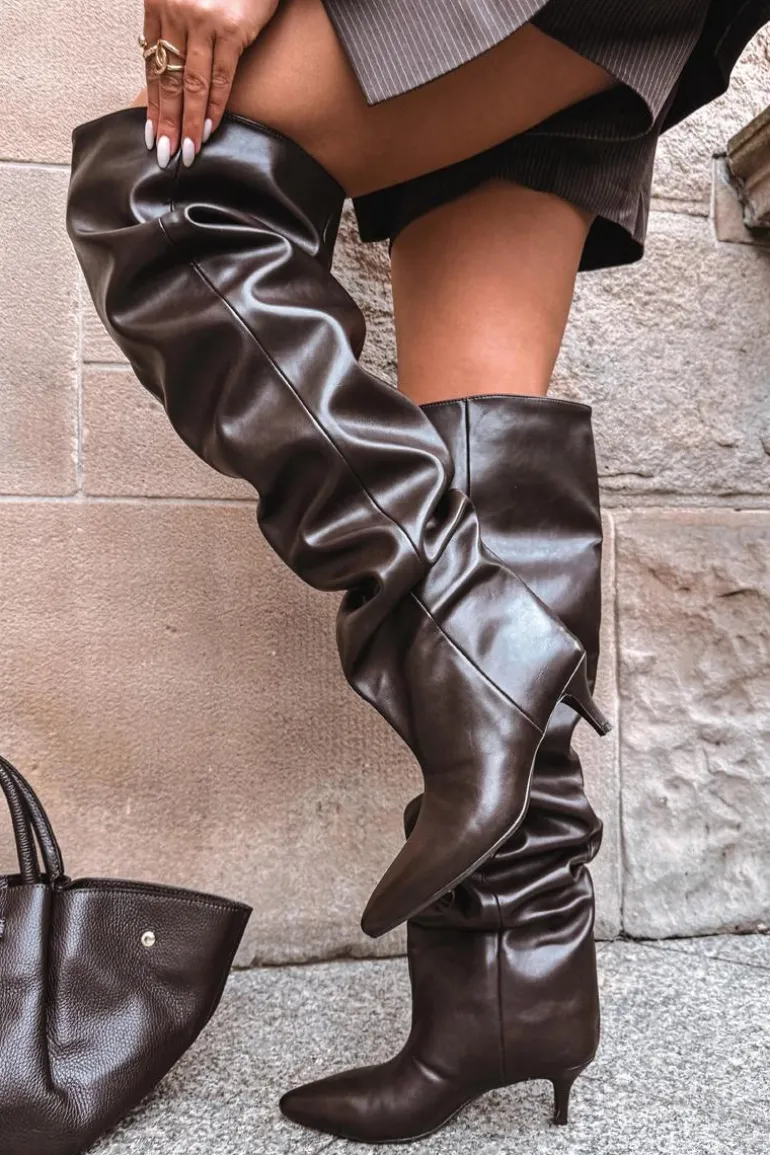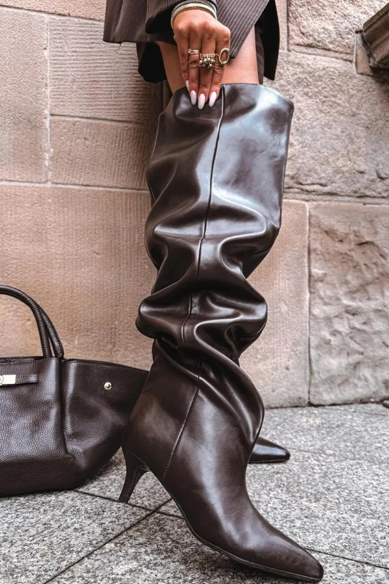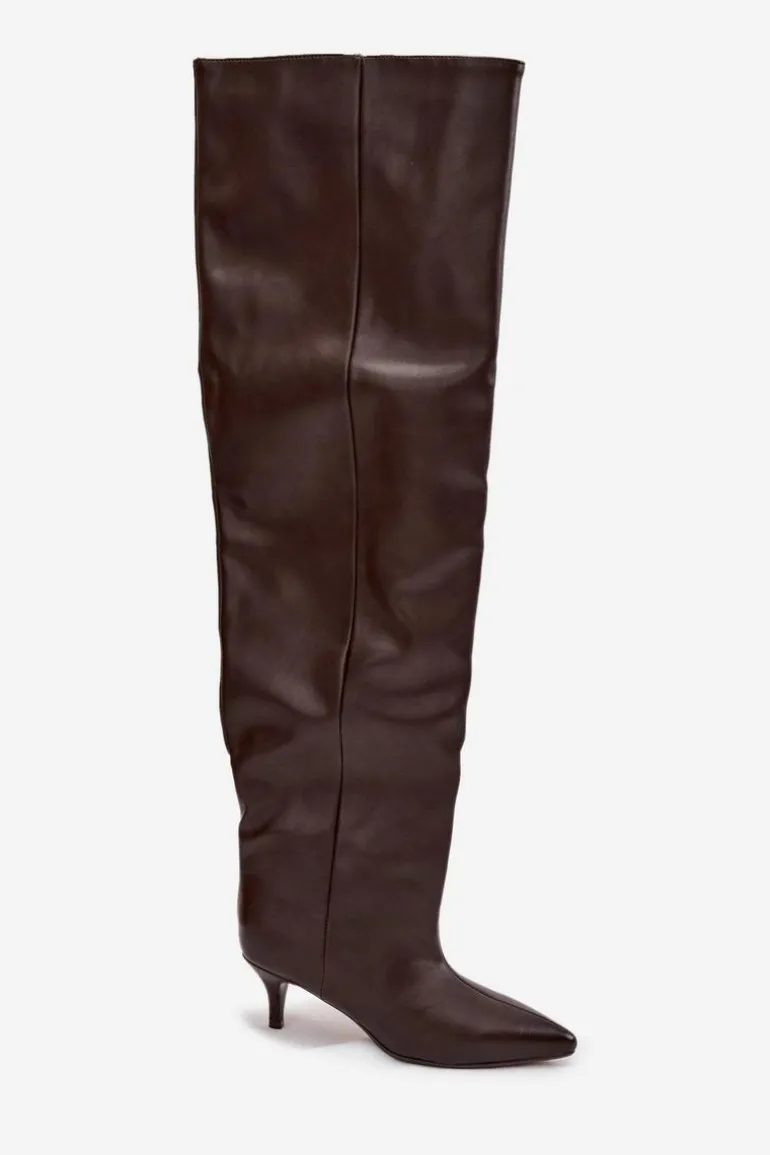 Kozaki damskie wykonane z eko skóry. Model został osadzony na niskiej szpilce. Charakterystyczną cechą butów jest szeroka cholewka, która nie tylko nadaje im modnego wyglądu, ale również sprawia, że kozaki są wygodne w noszeniu i łatwe do dopasowania do każdej nogi. Wsuwany fason ułatwia szybkie zakładanie i zdejmowanie, czyniąc obuwie praktycznym w codziennym użytkowaniu. To kozaki, które doskonale sprawdzą się zarówno w zestawieniach casualowych, jak i bardziej eleganckich stylizacjach, dodając im wyrafinowanego charakteru. Przy wyborze rozmiaru prosimy kierować tabelą rozmiarów.