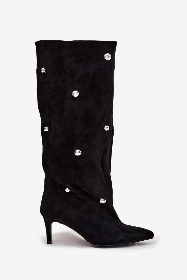 Wsuwane kozaki damskie na szpilce ze złotymi ozdobami czarne Thaliane