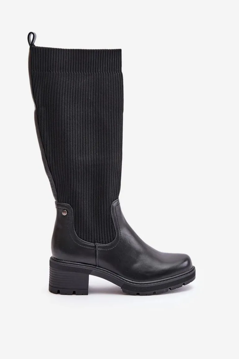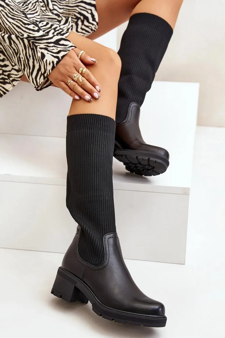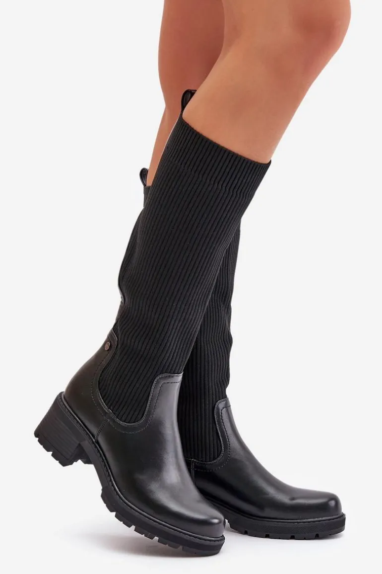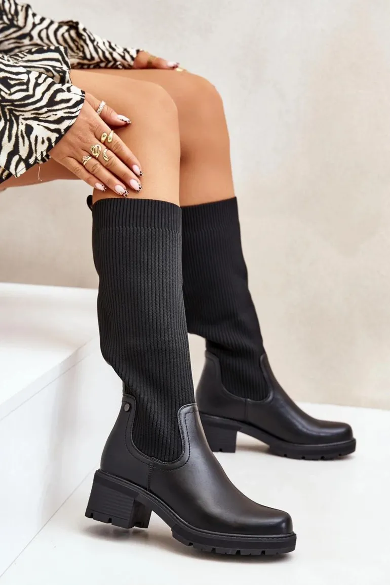 Kozaki damskie z elastyczną cholewką przed kolano. Wykonane z połączenia eko skóry i materiału tekstylnego. Osadzone na obcasie typu klocek. Model wsuwany. Wykorzystasz je w wielu stylizacjach! Koniecznie muszą być Twoje! Przy wyborze rozmiaru prosimy sugerować się tabelą rozmiarów.