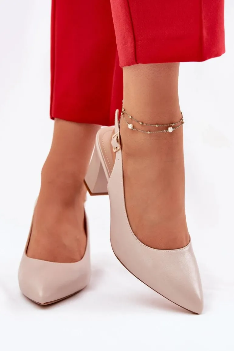 Wygodne czółenka osadzone na stabilnym obcasie w postaci słupka. Posiadają zapinanie wokół kostki na regulowany pasek ze sprzączką. Model z noskiem w szpic i odkrytą piętą. Buty te zostały wykonane z eko skóry, natomiast wkładka z naturalnej skóry. Ten model powinien znaleźć się w Twojej szafie! Przy wyborze rozmiaru prosimy sugerować się tabelą rozmiarów.