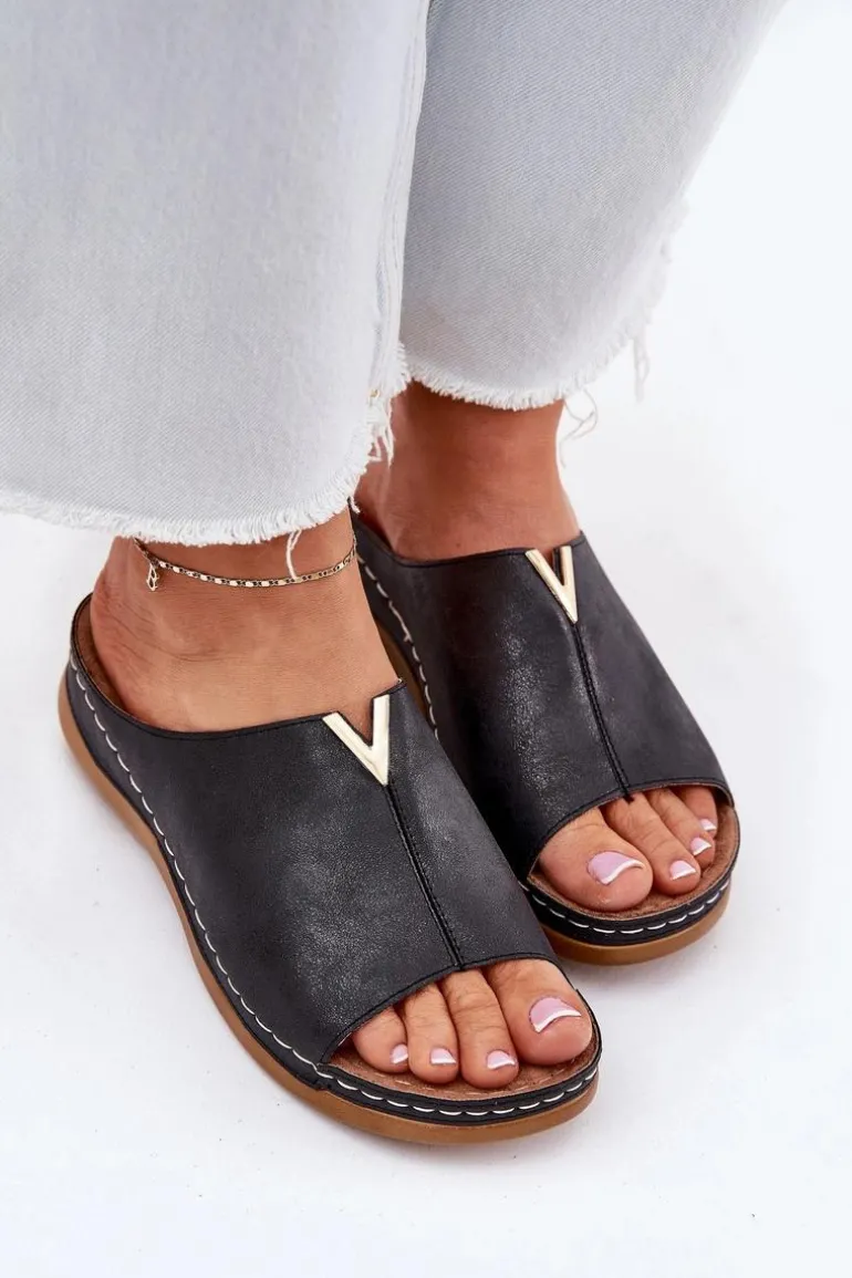 Eleganckie damskie klapki wykonane z eko skóry to połączenie stylu i komfortu. Osadzone na koturnie, zapewniają lekkość oraz stabilność przez cały dzień. Model ten posiada miękką wkładkę Comfortshoe z efektem poduszki, co gwarantuje wygodę nawet przy długotrwałym noszeniu. Te klapki doskonale komponują się z codziennymi stylizacjami, łącząc elegancję z funkcjonalnością. Idealne na ciepłe dni! Przy wyborze rozmiaru prosimy sugerować się tabelą rozmiarów.