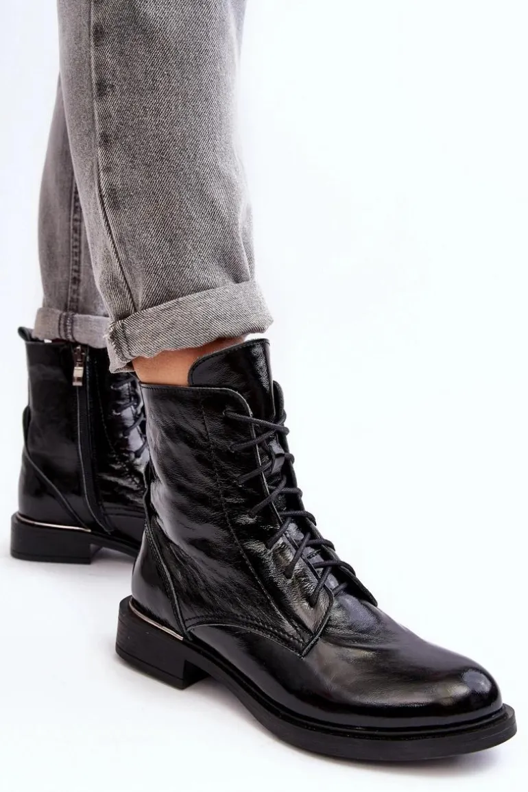 Klasyczne botki damskie zostały wykonane z wysokiej jakości naturalnych skór. Model ten posiada klasyczne sznurowanie oraz suwak z boku cholewki. Usztywniany zapiętek zapewni stabilizację stopy. Botki zostały ocieplone kocem obuwniczym. Osadzone na płaskim obcasie i delikatnej platformie. Przy wyborze rozmiaru prosimy sugerować się tabelą rozmiarów.