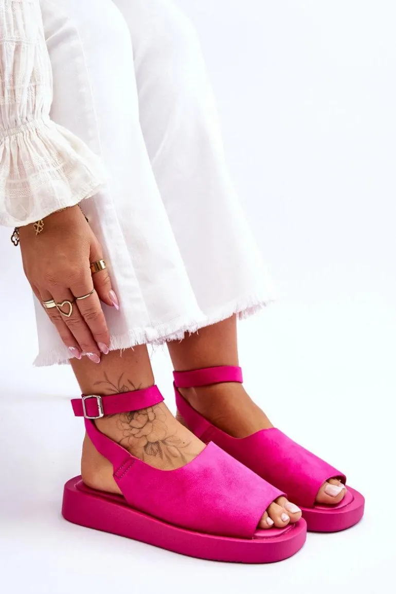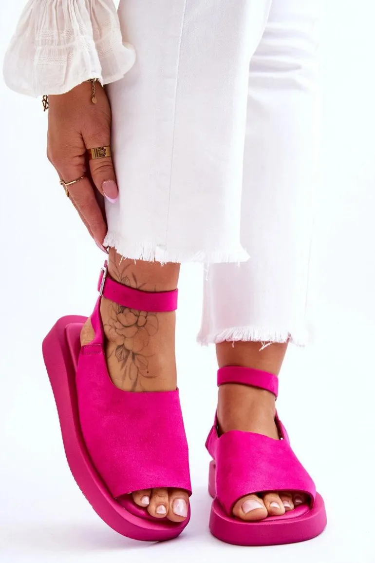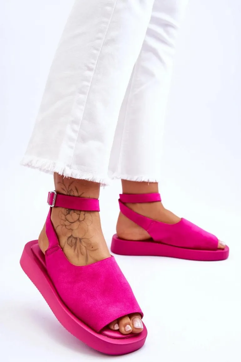 Wyjątkowe sandały damskie na platformie. Buty te zostały wykonane z miłego w dotyku eko zamszu. Posiadają miękką, eko skórzaną wkładkę. Sandałki są zapinane wokół kostki na regulowany pasek ze sprzączką. Ten niezwykły model z pewnością wzbogaci Twoją letnią garderobę! Przy wyborze rozmiaru prosimy sugerować się tabelą rozmiarów.