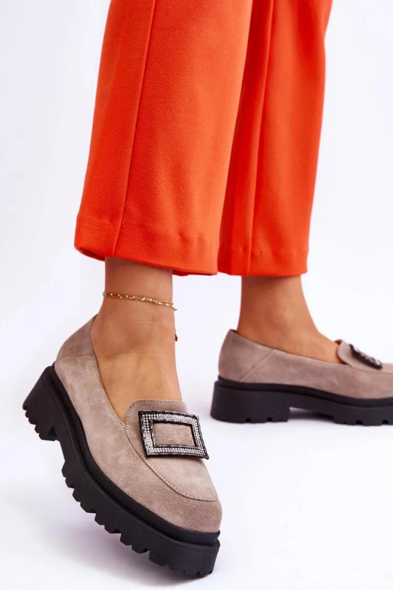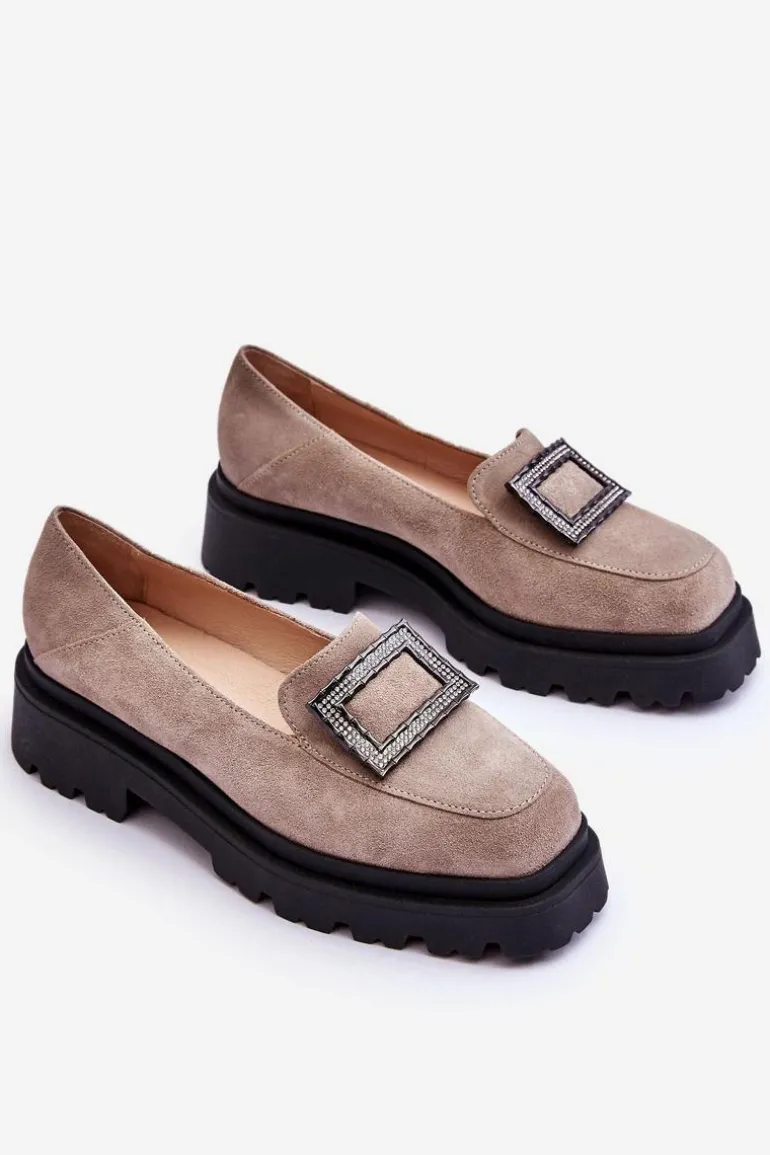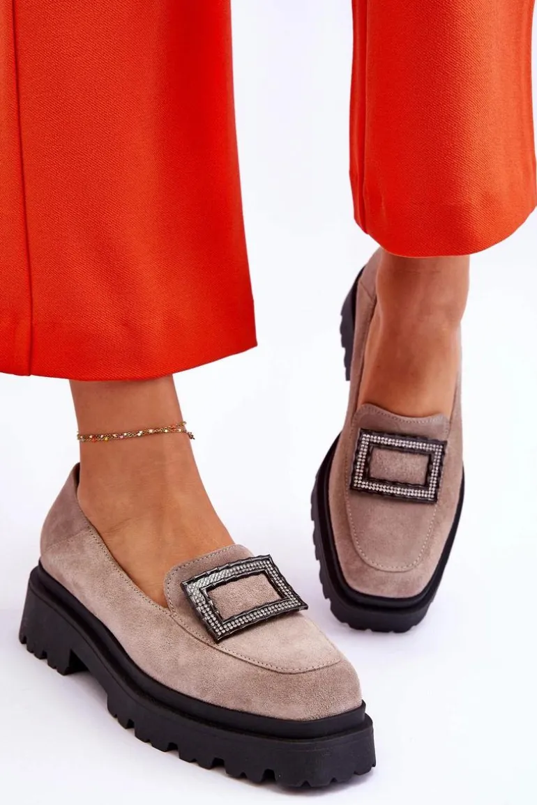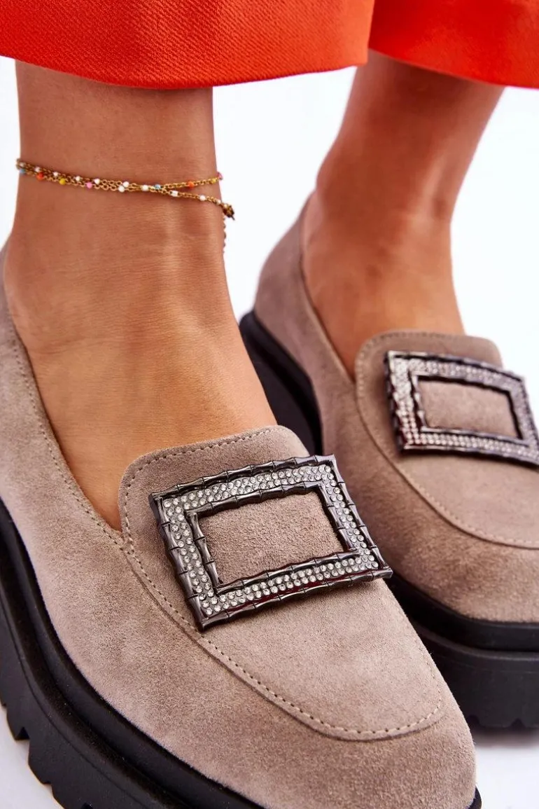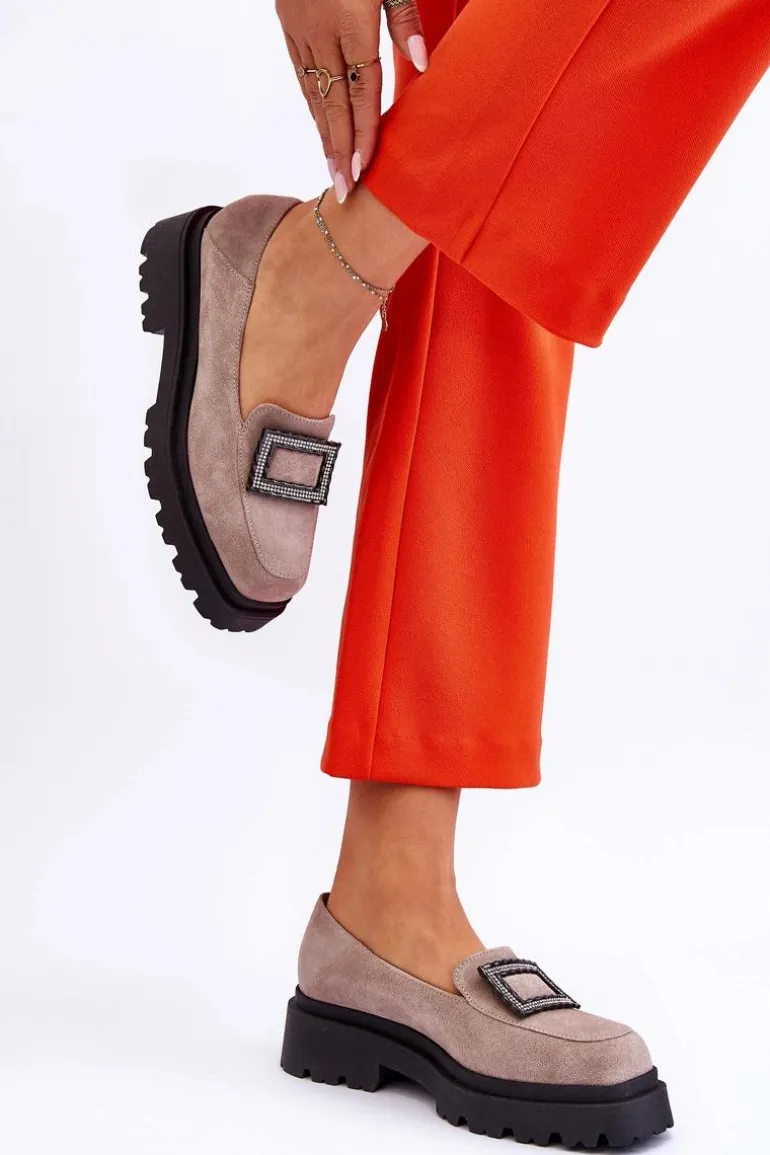 Modne, damskie mokasyny zostały wykonane z naturalnej skóry. Mokasyny osadzono na masywnej platformie oraz płaskim obcasie. Dodatkowo posiadają ozdobę z przodu z dżetami oraz usztywniany zapiętek. Miękka wkładka zapewni komfortowe użytkowanie. Mokasyny świetnie sprawdzą się w wielu stylizacjach! Przy wyborze rozmiaru prosimy sugerować się tabelą rozmiarów.