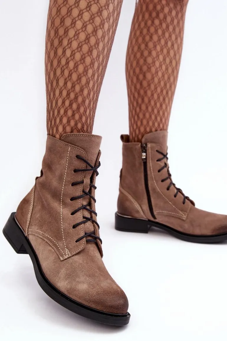 Klasyczne botki damskie zostały wykonane z wysokiej jakości naturalnych skór. Model ten posiada klasyczne sznurowanie oraz suwak z boku cholewki. Modne przetarcia na przodzie oraz tyle buta wyróżniają ten model na tle innych. Usztywniany zapiętek zapewni stabilizację stopy. Botki zostały ocieplone kocem obuwniczym. Osadzone na płaskim obcasie i delikatnej platformie. Przy wyborze rozmiaru prosimy sugerować się tabelą rozmiarów.
