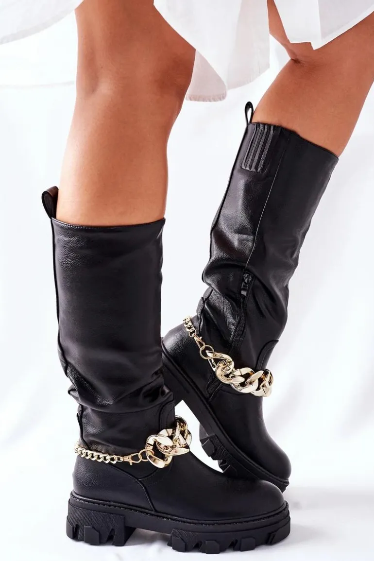 Kozaki do kolana wykonane ze skóry ekologicznej. Wnętrze ocieplane kocem obuwniczym.