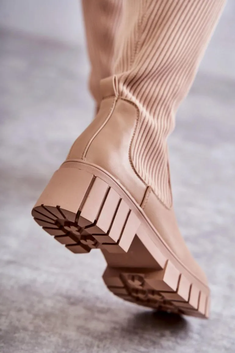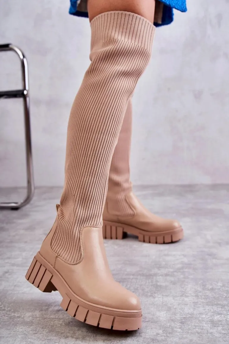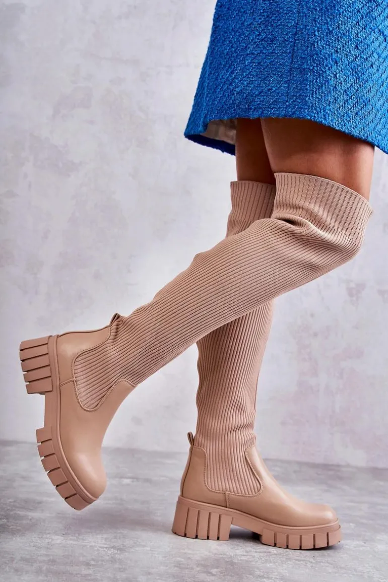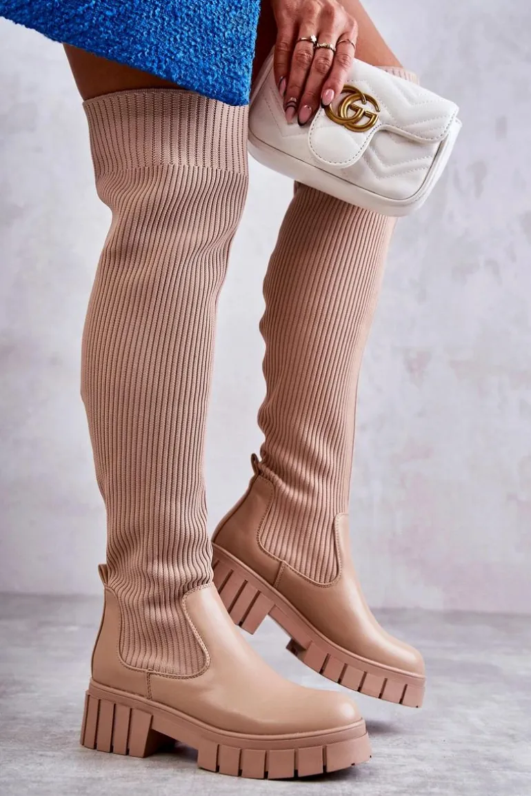 Modne damskie kozaki zostały wykonane z połączenia eko skóry oraz prążkowanej tkaniny. Cholewka za kolano. Model osadzony na płaskim obcasie i delikatnej platformie ze żłobieniami. Buty te posiadają ocieplaną wkładkę. Nosek zaokrąglony. Model wsuwany. Świetnie będą prezentować się z sukienkami lub spódniczkami mini. Przy wyborze rozmiaru prosimy kierować tabelą rozmiarów.